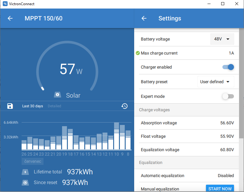 Da sa to obist, resp. FW MPPT regulatoru to dovoluje ak sa prepne do ESS/BMS modu, tak sa da riadit cez VE-Direct ziadane napatie, resp. prud (ziadana hodnota musi byt posielana opakovane, inak prejde na default hodnoty). Tento mod pouziva aj Color Control GX - pozri DVCC, je tam ale obmedzenie ze na LiFe len ak pripojena BMS co vie komunikovat s GX.xmasin píše:Jen upozornění k tomu limiteru, omezí to celkový proud na výstupu z regulátoru, takže pokud je k baterkám připojen i měnič s vytěžováním, tak regulátor nikdy nepustí do DC sběrnice větší proud než má nastaven v limiteru.