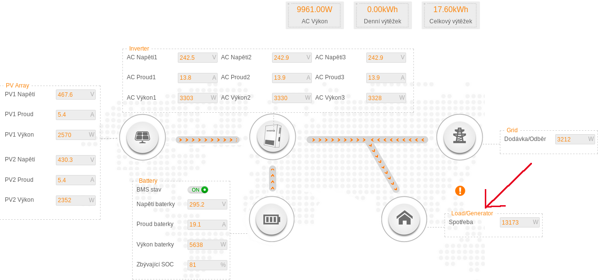 Jako toto? viz šipka To podle mne není žádný zázrak, to umí snad každý HV hybrid. Nenašel jsem ovšem ještě takový, který by ten druhý zdroj udržel v chodu i bez distribuční sítě (s funkcí mikrosítě). I když Solax umí paralelní chod více kusů střídačů i bez distribuční sítě, ale jiný zdroj (cizí střídač) neumí, frekvenční posuv tam není naprogramován a střídače musí spolu komunikovat. Dodavatel Solaxu mne informoval že by se to muselo doprogramovat do firmware, ale hardwarově by to neměl být problém.rob.brno píše:GW má umět nabíjet aku z přebytků na AC straně, to je výhodou při druhé souběžné ongrid FVE.