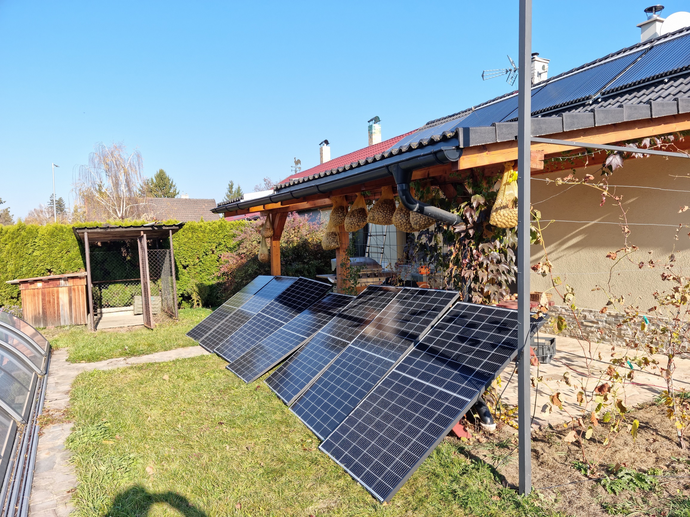 Tak jsem včera posílil a provizorně připojil dalších 2345Wp celkem instalováno 10640Wp.Asi je zatím nebudu dávat na střechu a nechám si je na zimní hraní.Vyzkoušení sklonu a směru.Elektřiny je v těchto dnech dostatek, základní cíl na cca 9 měsíců samostatnosti je splněn,když nevím co s elektřinou pouštím na cca 3 hodiny denně 2kW konvektor,asi by stálo za to přepojit elektrokotel.Topná sezona zatím nezačala.Od léta jsem zatím nemusel za peníze zatopit ani přihřívat vodu.