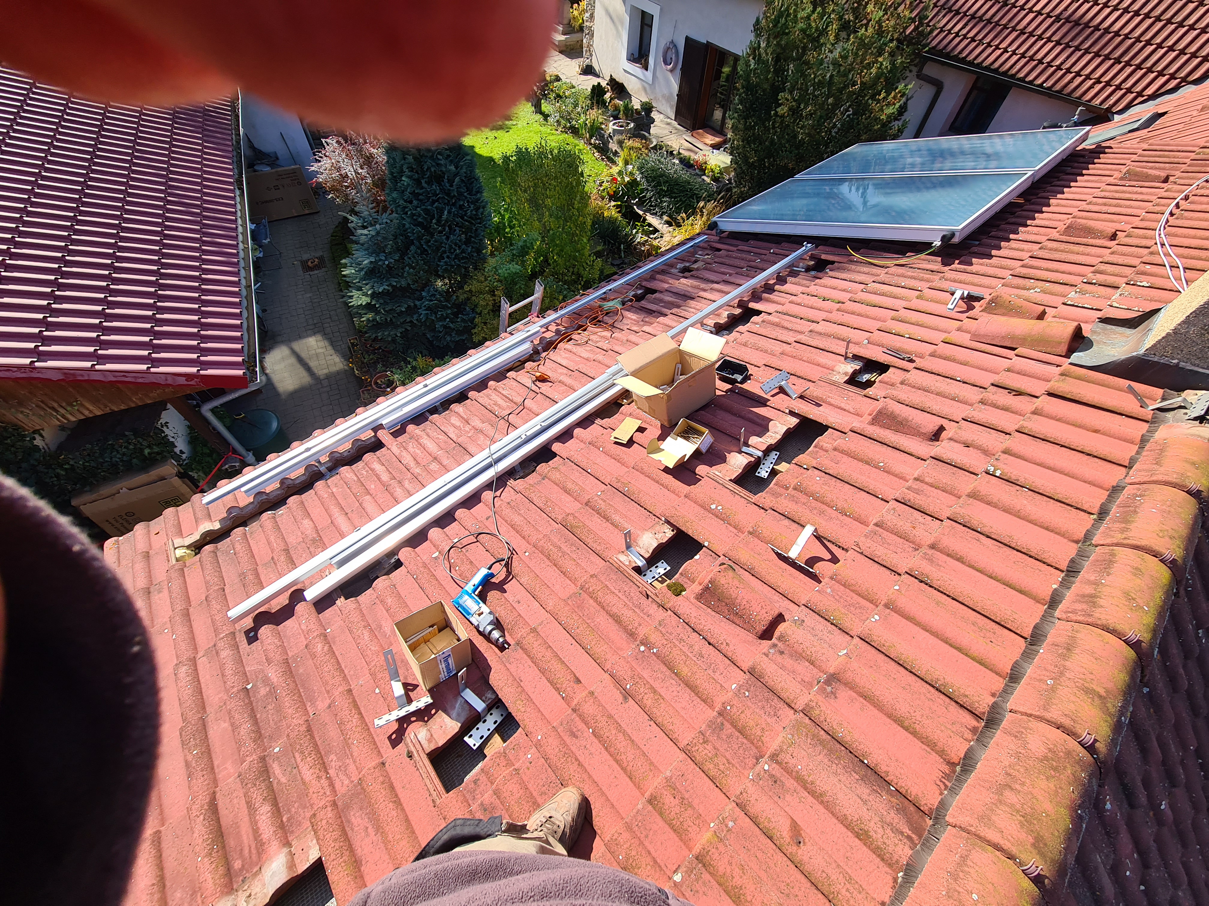 Namontovány držáky a osazeny panely na střechu ... Byla fakt slušná pakárna, hlavní problémy jsem si způsobil sám. Koupil jsem dvoupanelové montážní sety a moc jsem u toho nepřemýšlel. Takže mi chybělo spojení montážních setů dohromady, měl jsem málo mezipropojek a téček. Pak další ultrapakárna a protože jsem wattů chtivý tak mi to vyšlo do hřebene
