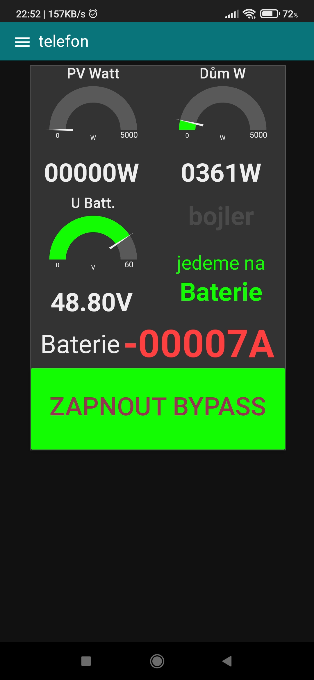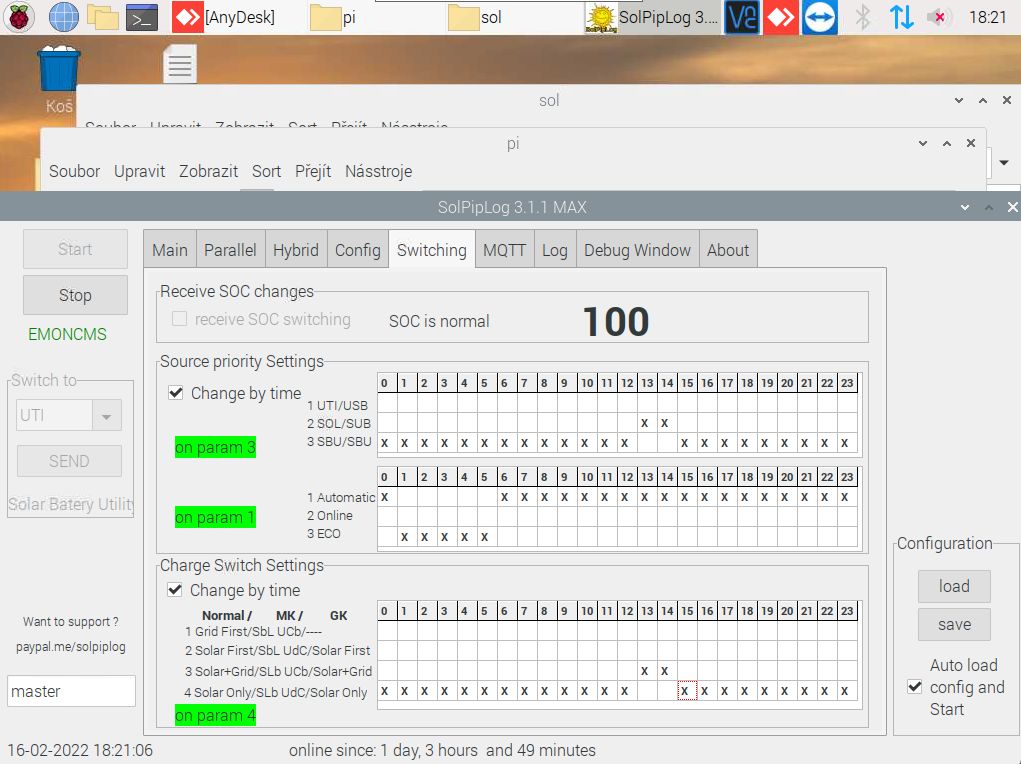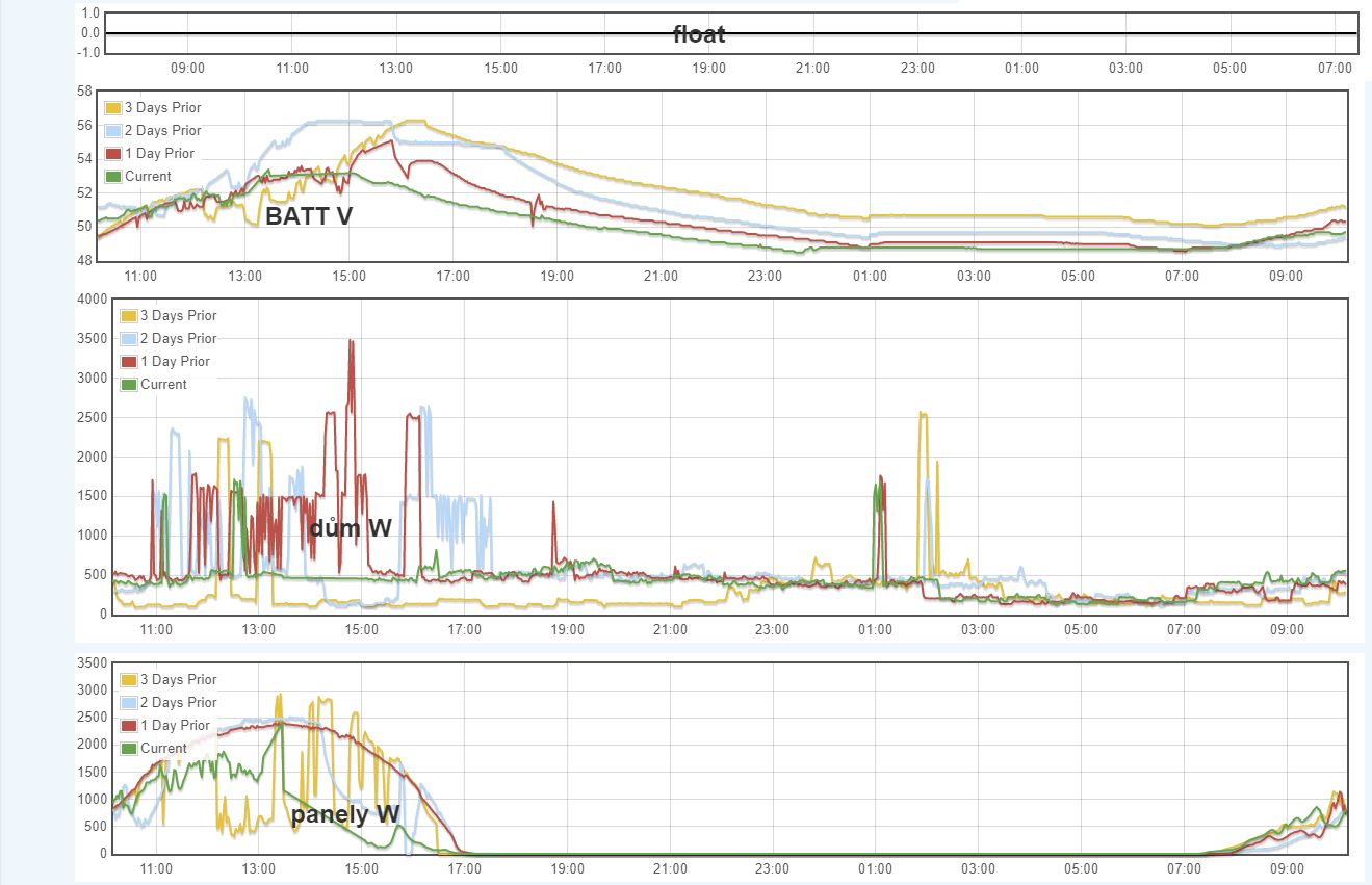 tak dnes po návratu domů nejde měnič přepnout na BAT (SBU) buď jede v modu DS (UTI), a nebo jde shodit do bypassu (ECO), z panelů se baterie dobijí, ale na baterii měnič přepnout nejde, musel jsem vše shodit (FV+BATT) pak vše zase nahodit, rozběhnout komunikacu a pak se vše už rozběhlo