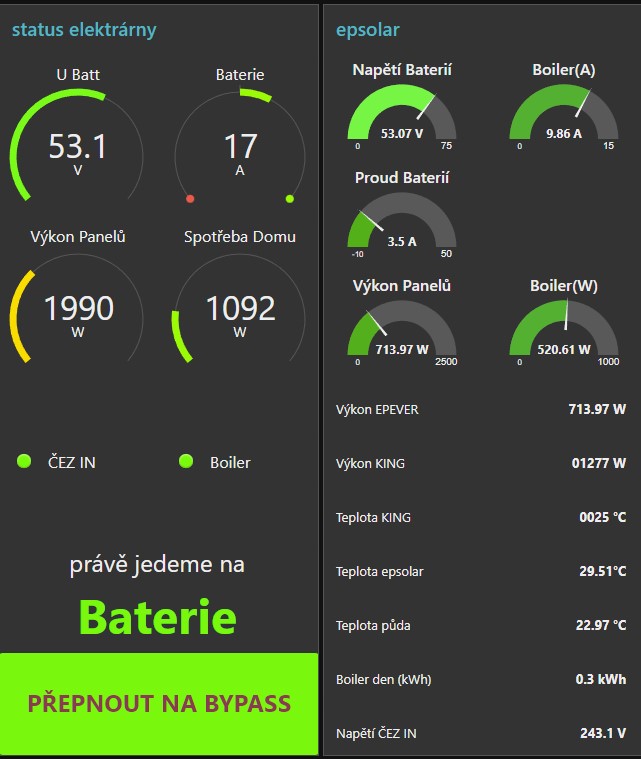 vono například s axpertem to jde relativně jednoduše a ač se musím přiznat, že jsem se zařekl, že si s windejsema už vystačím a toho se držím, donutil jsem 13tiletýho syna nainstalovat malinu, na to dát program solpiplog kterej sám už na určitý hodnoty stačí, nicméně tento program dále umí posílat data do webové aplikace PVoutput a dále do (i) lokální aplikace emoncms, my to máme ještě vložený do dalšího programu který se jmenuje nodered, ten máme hlavně kvůli zobrazování a dnes i ovládání měniče na telefonu v kuchyni, aby manželka viděla kdy může vařit elektrikou a kdy už musí na plynulemra79 píše:... Ale moc by mě lákalo si na RPi rozběhnou něco jako ICC, komunikace s měničem, databáze, grafana. ...