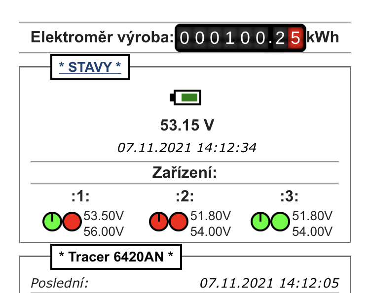D34: 3,3kWp 174° (6*235 Wp + 6*310 Wp) + EPsolar Tracer 6420AN + Epsolar IPower IP5000-42-Plus-T + 4* VRLA GEL 12V/150Ah + 16*LiFePo4/120Ah, WIFI: 50Wp 174° + PWM KLX1230+3*VRLA AGM 12V/17Ah, Včely: 10Wp 180° + Epsolar LS LS1024B + VRLA AGM 12V/17Ah, Automatizace: 15 * Wemos D1 mini/lite
