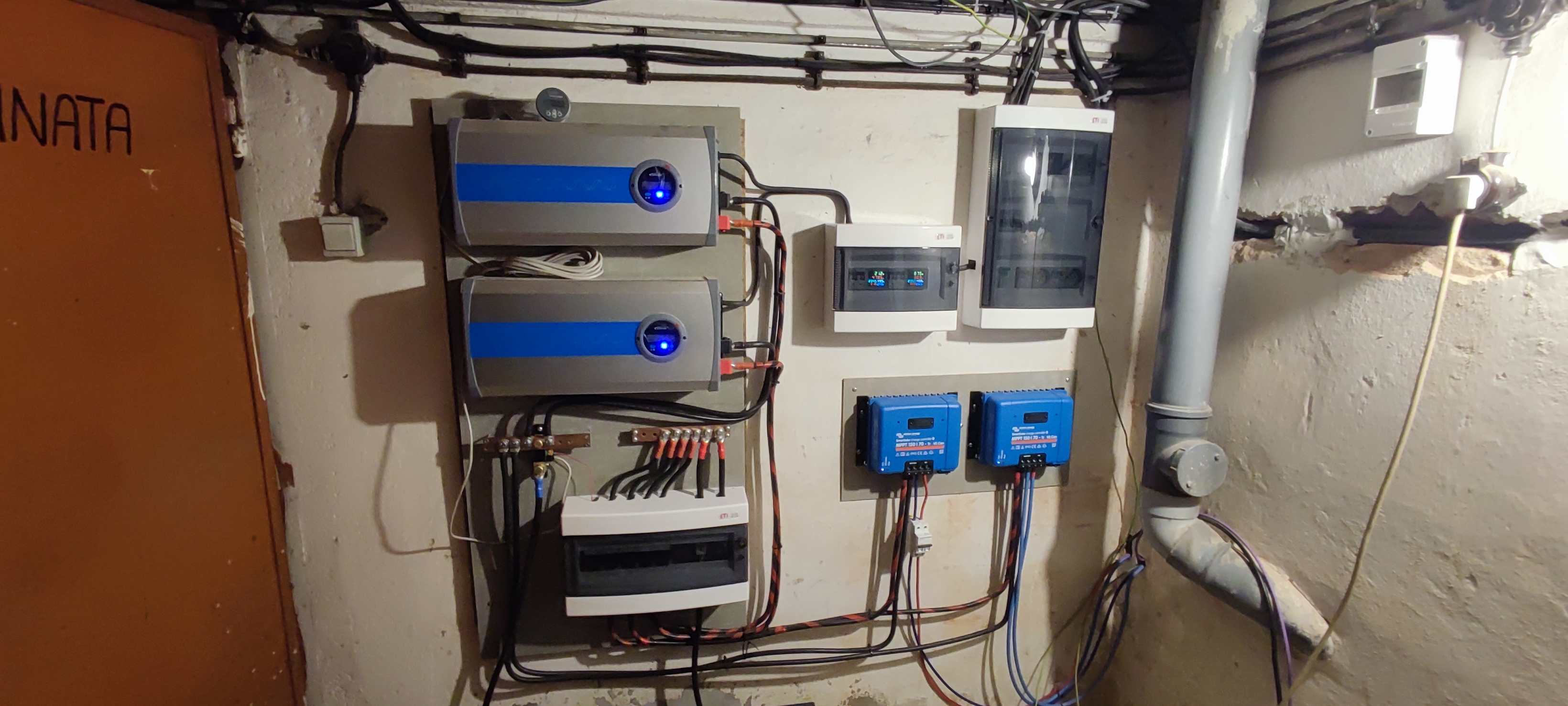 6kWp MünchenEnerg., 4,6kWp OK Panel; 2x Victron MPPT 150/70, 1x Victron MPPT 150/35; 24kWh(30kWh max) 48V LiFePO4 (mivvy + CALB čína); 2x EPEver iPower 5000 48V, 1x Victron Phoenix 3000
