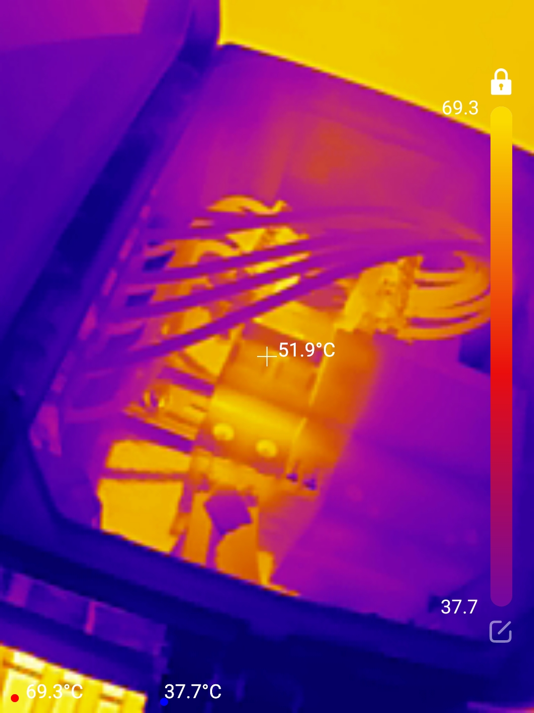 K elektrárně jsem doplnil svodiče přepětí typu 1 a 2 k panelům a před regulátory. Při maximálním výkonu vypadá teplotně rozvaděč asi takto: (Je to venku pod panely, venku nad 30°C, systémem jde kolem 50A, dimenzováno na 63A) A to už je skoro vše. Ještě zbývá doplnit, že jsem zrušil veškeré chytré řízení a ještě nevytvořil novou instalaci. Nefunguje mi tak posílání přetoků do bojleru a vypínání měničů podle SOC (nyní pouze podle napětí). Nemám teď možnost dobíjet ze sítě automaticky podle SOC (můžu jen ručně připojit klipsy a nabíjet, ale to moc pohodlné není).