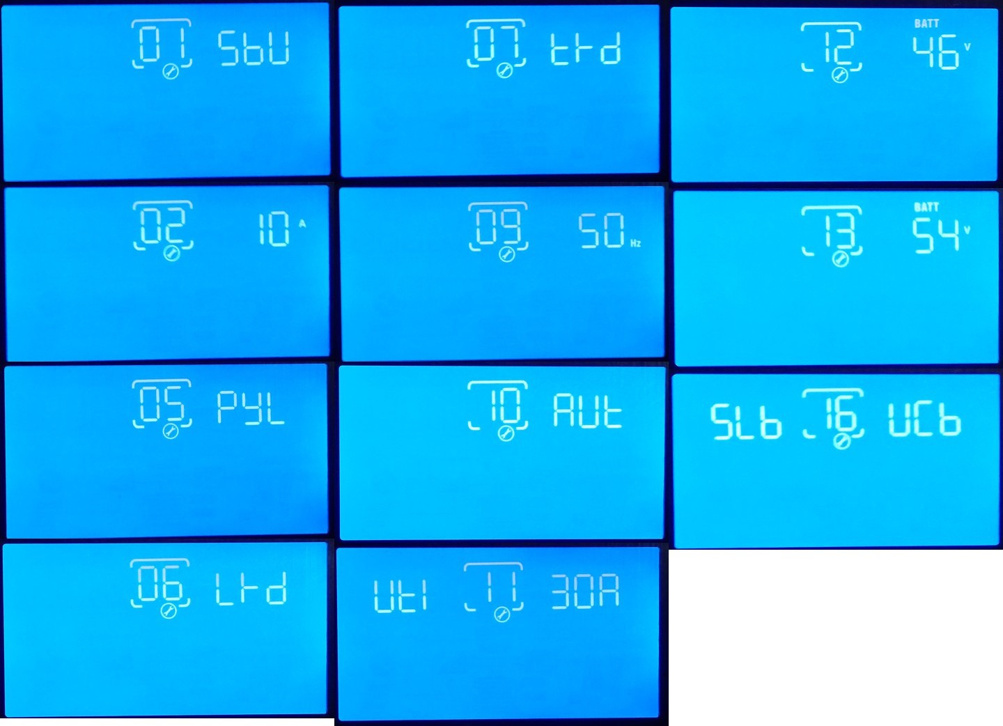Jestli chceš, aby to celé fungovalo, tak musíš mít TRVALE připojenou baterii, kolébkový vypínač v TRVALE poloze ON a ideálně když bude svítit slunce. Měnič bude vyrábět 230V z baterie a v té samé chvíli bude baterie dobíjena z panelů. AC napájení pro začátek zcela odpoj, ať se ti tam neplete. Režim zvol třeba SBU (solar-battery-utility).