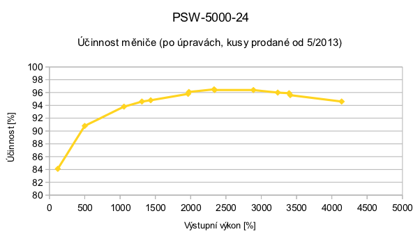 Mám tu veľmi zaujímavú novinku. Výrobca PowerJack začal do nových kusov meničov osádzať iné transformátory - s výrazne menšími stratami. To sa prejavilo na celkovej účinnosti meniča a v kombinácií s ďalšími extra úpravami, čo zahŕňa masívne posilnenie silových trás na doske plošných spojov, je výsledkom až prekvapivo vysoká účinnosť meniča. Pôvodne som to sem nechcel dávať, lebo určite sa nájdu skeptcici, ale meral som to tými istými zariadeniami ako meriam účinnosť všetkého a overoval som to aj inou metódou. Proste nech meriam ako meriam .. maximum je cez 96%!
