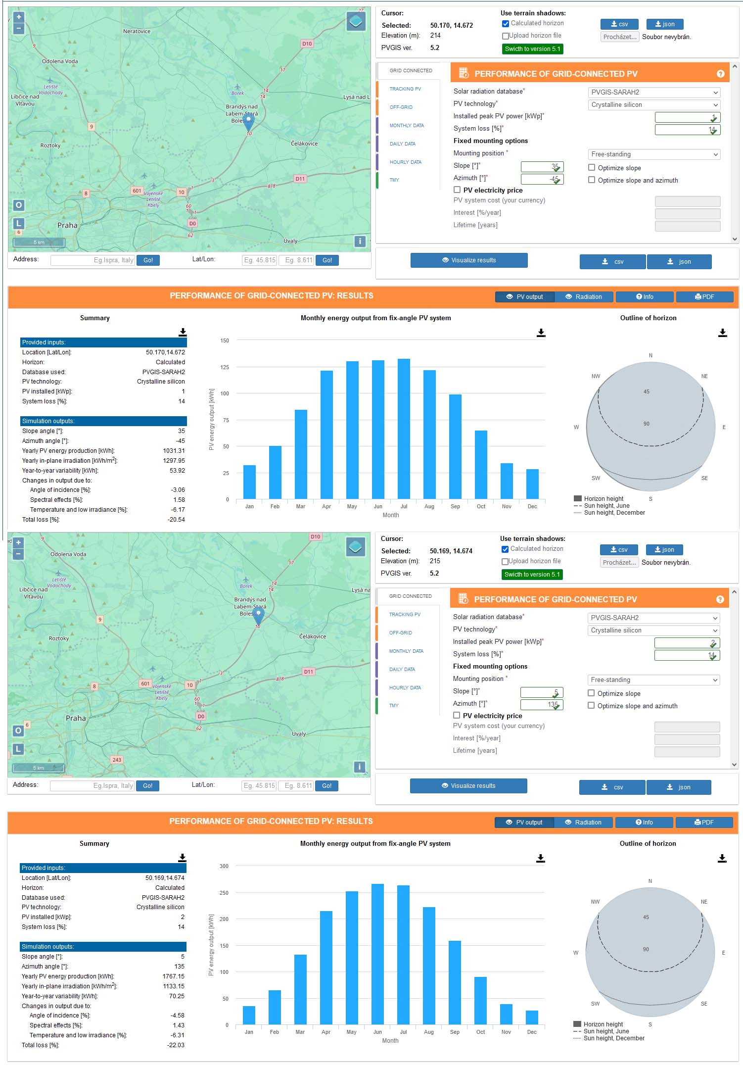 Máš to špatně. Střecha je orientovaná -150° od Jihu s 5°sklonem a současný stav je konstrukce (25°sklon) +50°k západu. PVGIS počítá Jih jako 0°.