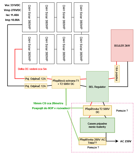Panely budu montovat na plechovou strechu garaze, nic na dome uzemneno neni, "zatim" se blesky zdejsi lokalite vyhybaji (tzn. Predpokladam ze na primy zasah je minimalni sance), dava tento diagram v moji situaci smysl? Garaz je hned u domu, DC povede hned do kotelny v chranickach, kazdy pol samostatne