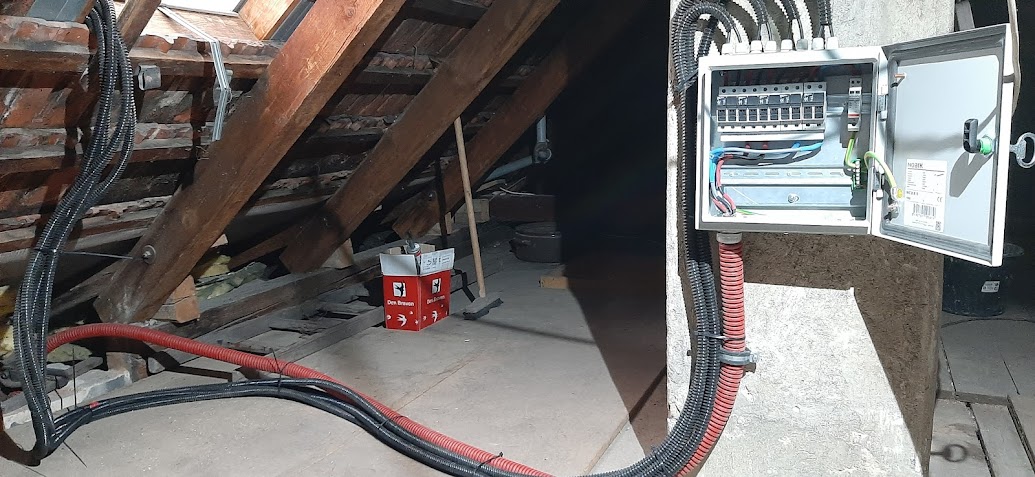 Na půdu se dává tzv.kombiner box kde jak vyplývá z názvu jdou stringy různě propojit,odepnout a měřit.Obsahuje (měl by) přepěťové ochrany a tudíž k němu je třeba přivést vodič s uzemněním.Je to vlastně malý rozvaděč.Na půdu bych upřednostnil kovové provedení a umístění na nehořlavou podložku.Místo těch konektorů MC4 je lepší stringy zapojit přímo vývodkami na odpojovače.Jsou to zbytečné spoje.V tom horním obrázku se vyvarovat těch spojek MC4 slučujících dva nebo tři vodiče do jednoho,ale zavést do boxu a tam provést propojení,je to zdroj problémů.Ve vašem případě považuji 25mm/2 za luxusní průřez.