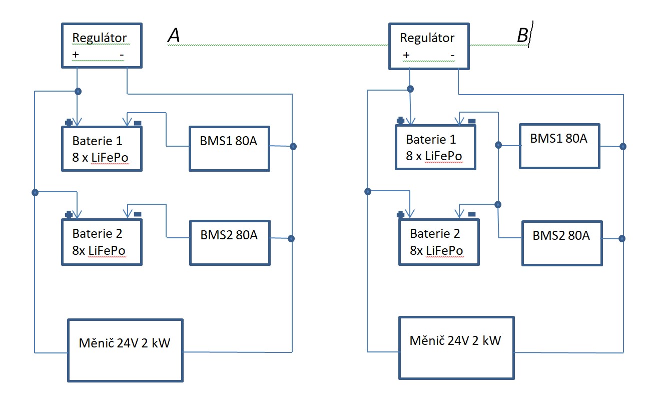 Chystám se na druhý pack 8xLiFePo 280Ah. Pročítám vlákna o paralelních spojení baterek, nikde jsem se nedočetl (možná čtu špatně) jak se budou chovat zapojení dle obrázku varianta A a varianta B . BMS je Smart Daly. Někdo spojuje baterie napřímo někdo ne. Co moudří doporučují? Jakou SOC podle varianty v BMS a v regulátoru nastavit?