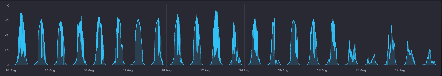 Za srpen nejvyšší výkon 4,9 kW a dále 5x výkon přes 4 kW (kolem 4,1 kW).