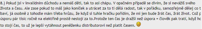 Ta anketa měla za cíl dokázat mi, že to pro mě má význam. Namísto toho se ji účastnilo 99 % uživatelů toho typu, který jsem prosil ať nepíšou, takže se mi sešly data docela k prdu. Nicméně Jeden z cílové skupiny se našel, přišel jsem na to, že návratnost mu vychází na několik desítek let, to i má sestava by měla návratnost za 22 let, on je na tom ještě hůř.