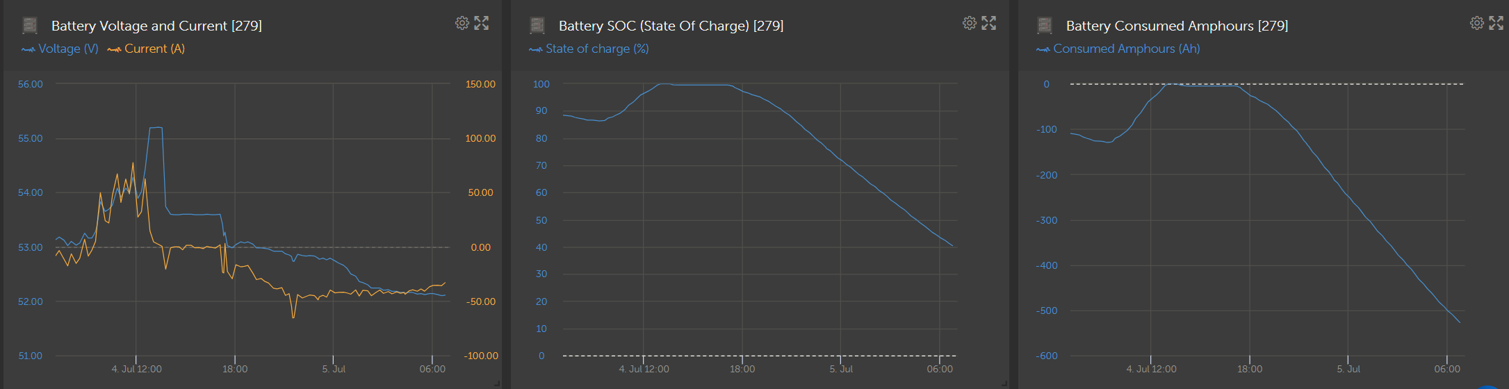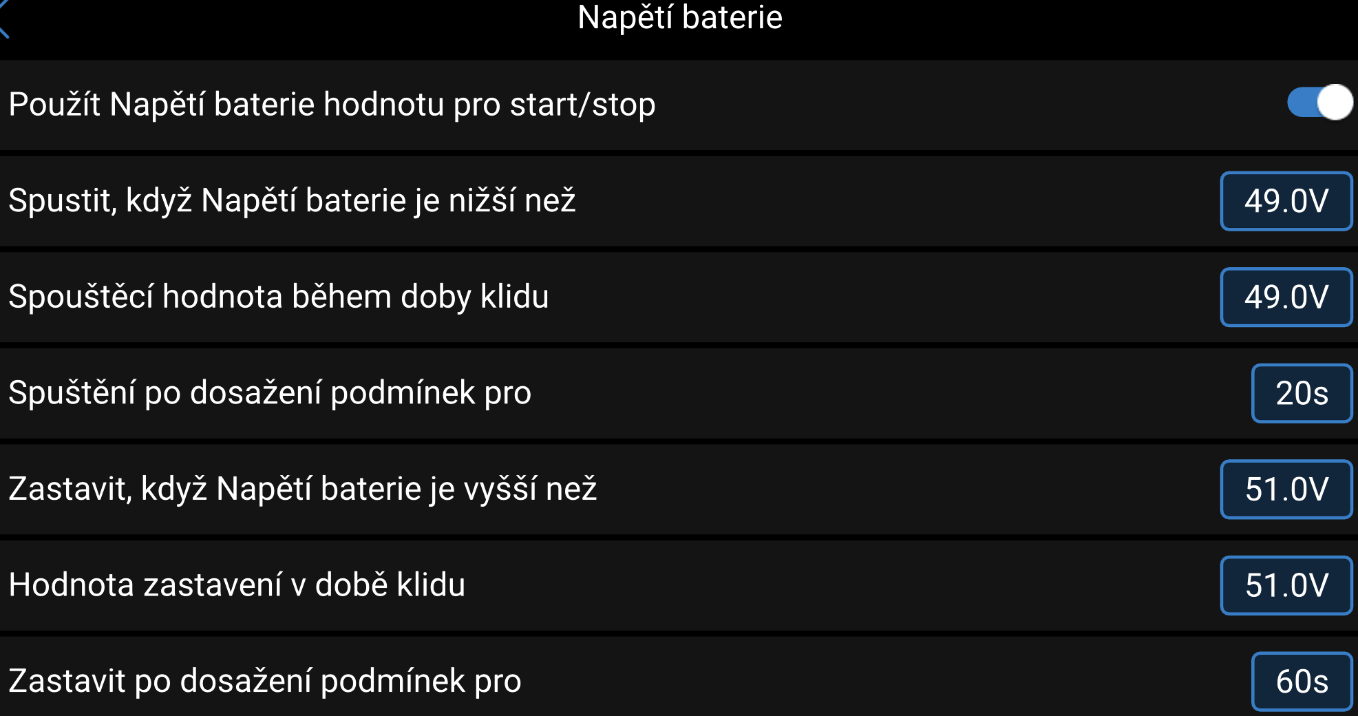Připnutí sítě mám nastaveno při poklesu SoC pod 30%, nebo poklesu napětí pod 49V, přes funkci Generator start and stop. Do zimy snad dokončím připojení nezávislé nabíječky.