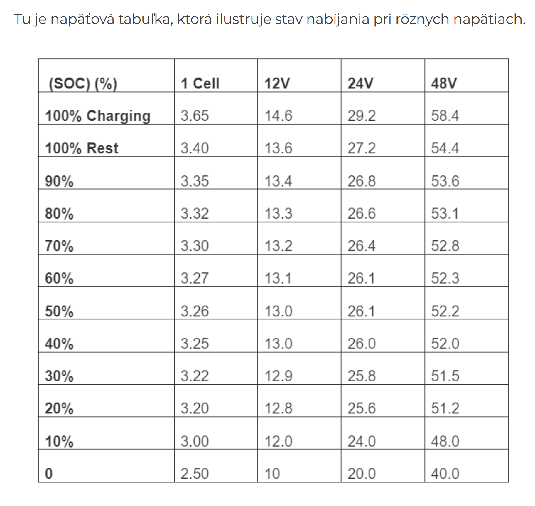 SoC je exaktná veličina len pri pravidelnej kalibrácii, a napätie batérie pripojenej do FVE už vôbec o ničom nevypovedá (obzvlášť pri nízkej kapacite a/alebo vyššom vnútornom odpore článkov). Ak máš povedzme reálne SoC 60% (tabuľkovo 3.27V) a nabíjaš ju výkonom 4 kW, tak ti vyskočí napätie kľudne na 3.37V (92% podľa tabuľky), a naopak, pri odbere 4 kW spadne na 3.15V čo je povedzme 18%. Preto treba zohľadňovať aj tieto podmienky.