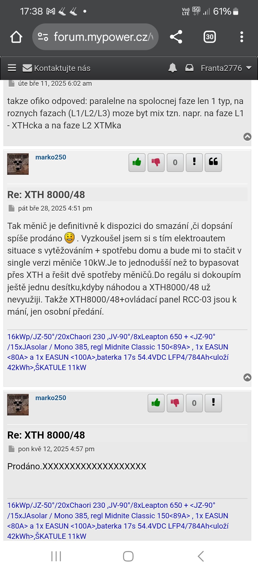Radost mi určitě nekazíš, na mé použití je ideální. Než ho zapojim to potrvá ale bude jako master a do něj sériově mp2,5kVA a do něj Phoenix 5kVA. Takže o dostatečný výkon se nebojím.Franta2776 píše: čtv kvě 15, 2025 3:00 pmTak ho otestuj, kolik hodin vydrží dávat 8kW a víc:))) a jak moc Victron kecá. Můj tip je, že bude horší jak ta 5000VA verze. Hmota toroidu je moc velká a ztráty v toroidu budou velké, toroid je silně poddimenzovaný a nepůjde to uchladit.Jeho váha je jenom 49kg a 48/5000 váží 32kg.To už od pohledu nevychází na 2x takový výkon:((( a tlumivku tam velkou žádnou na snížení ztrát nevidím. Tím Ti nechci kazit radost z nového měniče![]()