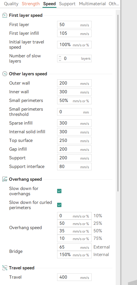 5) ja na Pruse viem este nastavit dalsie parametre. Rychlost vnutornych stien, chladenie (zvysil by som fan na 30-40% a LA/PA (LinearAdvance/PressureAdvance)
