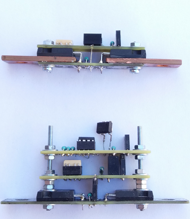 K zapojení z obrázku jsem došel po mnoha pokusech, kdy je použitelné jak v těle vodiče, tak i na sběrnicích, stejně tak i na plošném spoji. Při použití FET tranzistorů a malým odporem ve vodivém stavu je dokonce možné se obejít i bez chladiče. Konstrukce má vcelku dobrou pevnost. Varianta s měděnými převaděči, měděná pásovina zde není použita jako chladič, ale jako převodník tepla na případný chladič při jeho užití.