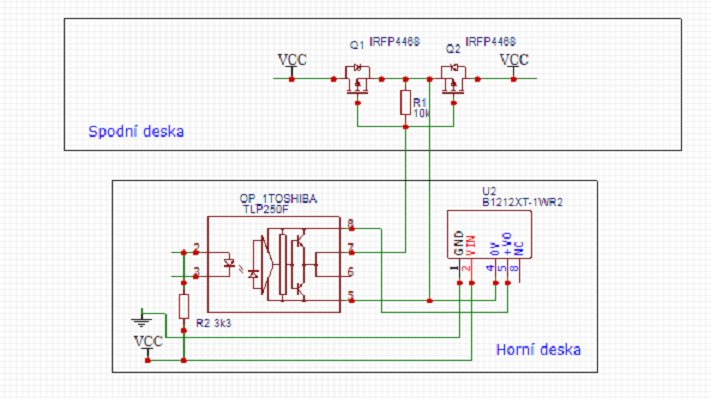 MOSFET tranzistor má dobrou vlastnost, že pokud přivedeme na elektrodu G oproti S kladné napětí, tento vede v obou směrech a jednu špatnou vlastnost, že má paralelní diodu jež vede jen v jednom směru. No a kombinaci dle obrázku jsou diody vyřazeny z činnosti a tranzistor je vodivý při kladném napětí na elektrodě G. Další problém spočívá v tom, že onen uzel S1S2, G1G2 je na proměnlivém napětí, tudíž je třeba použit izolovaný zdroj napětí pro uvedení tranzistorů do vodivého stavu. Tranzistory , nebo spíš jejich vodivost je odvislá i od napětí jež je mezi elektrody G a S přivedeno a při napětí nad 10V již tyto uvede bezpečně do vodivého stavu. Proto je použit izolovaný měnič 12/12V. Na optočlenu určenému právě ke spínání MOSFET tranzistorů je úbytek při seplém napětí asi 2V, tudíž se na G vůči S dostává právě oněch 10V, jež plně vybudí tranzistory do plné vodivosti.marko250 píše:......"Můžeš nám ..................