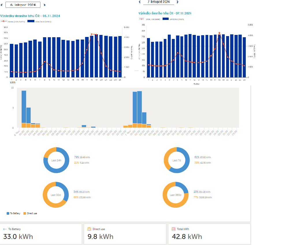 Na scr jsou ceny na burze a scr z VRM, kde je vidět odběr jen v levných hodinách. To pak stojí 1kWh 4,75Kč + roundtrip konverze 15% =>5.60 Kč a to je stále méně než ještě v létě firmy nabízely za fixní dodávku v D45d