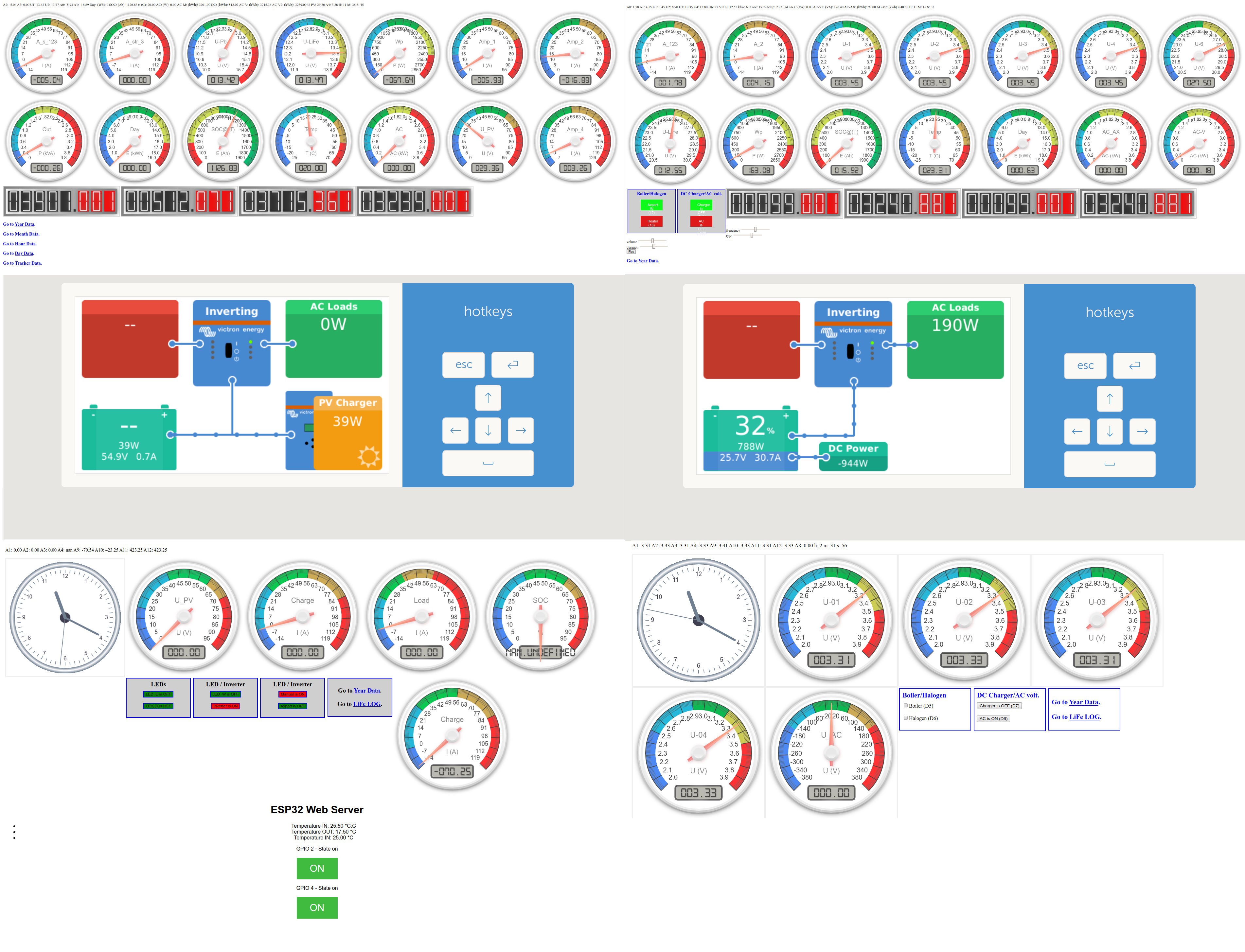FVE1 - 3kW do 48V 7.2kWh LiFe cez 5kW Axpert, FVE2 domcek pre maleho - 0.26kW do 12V 0.5kWh LiFe cez Victron375, termicky ohrev vody 200 l