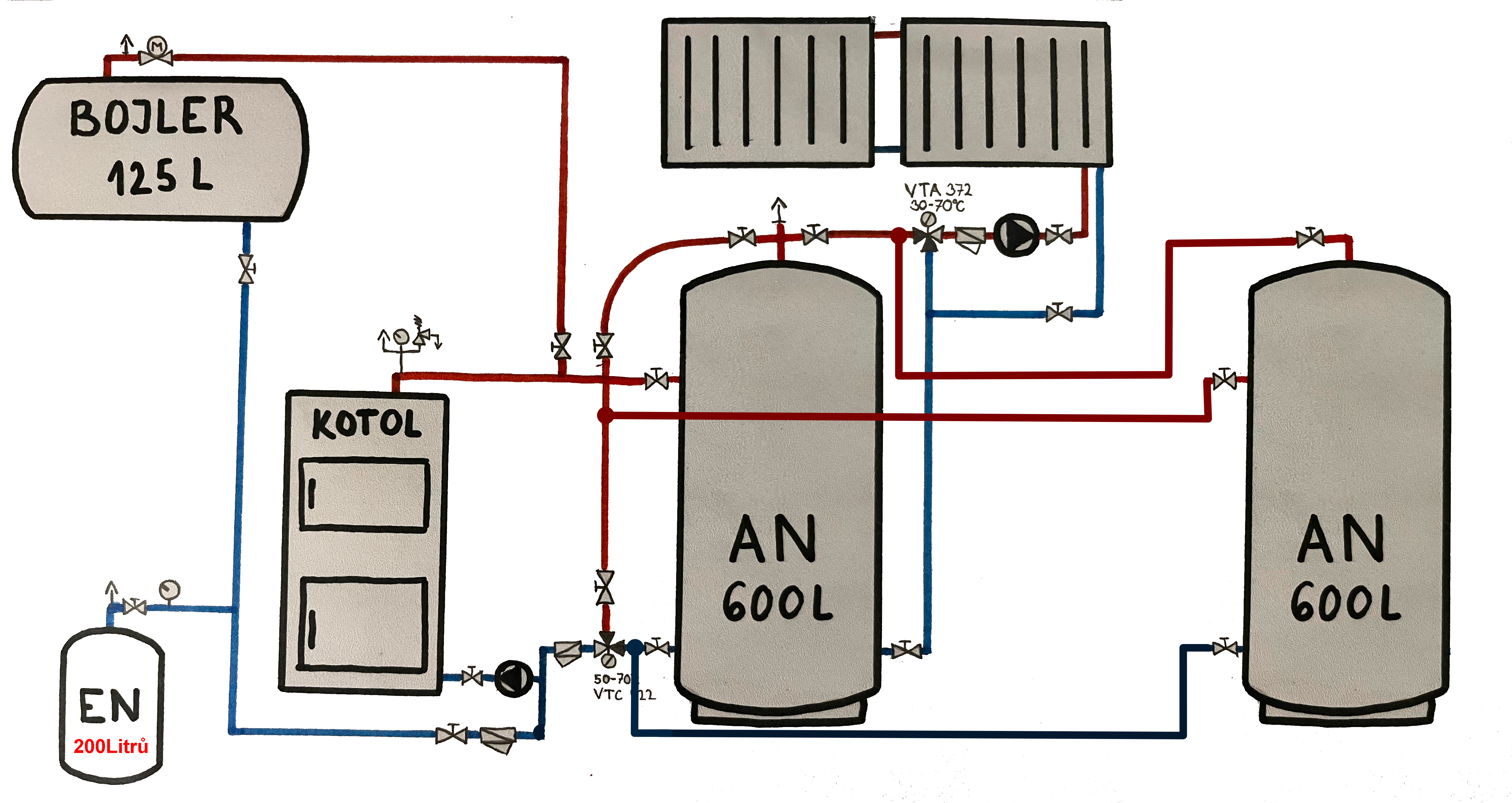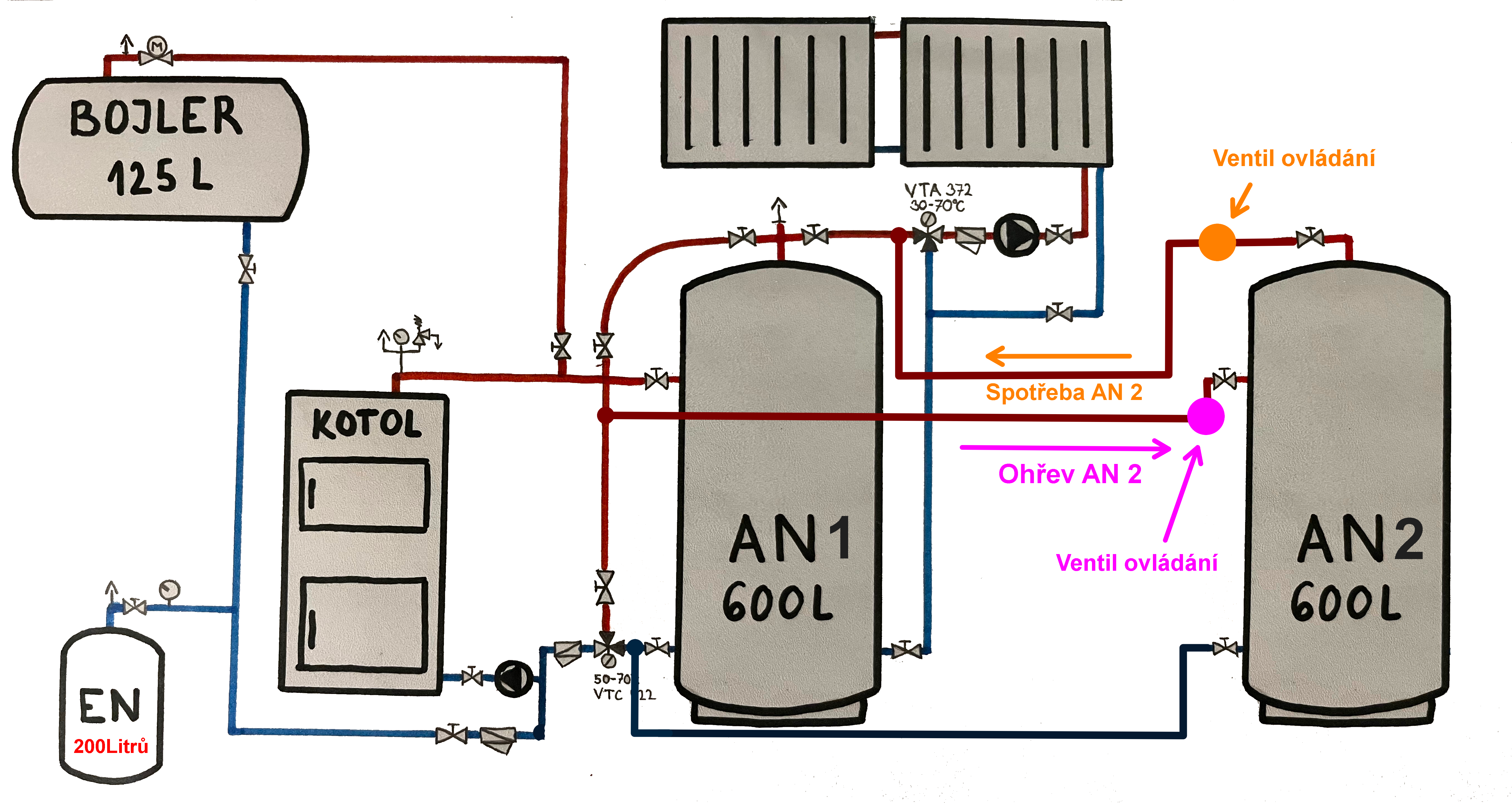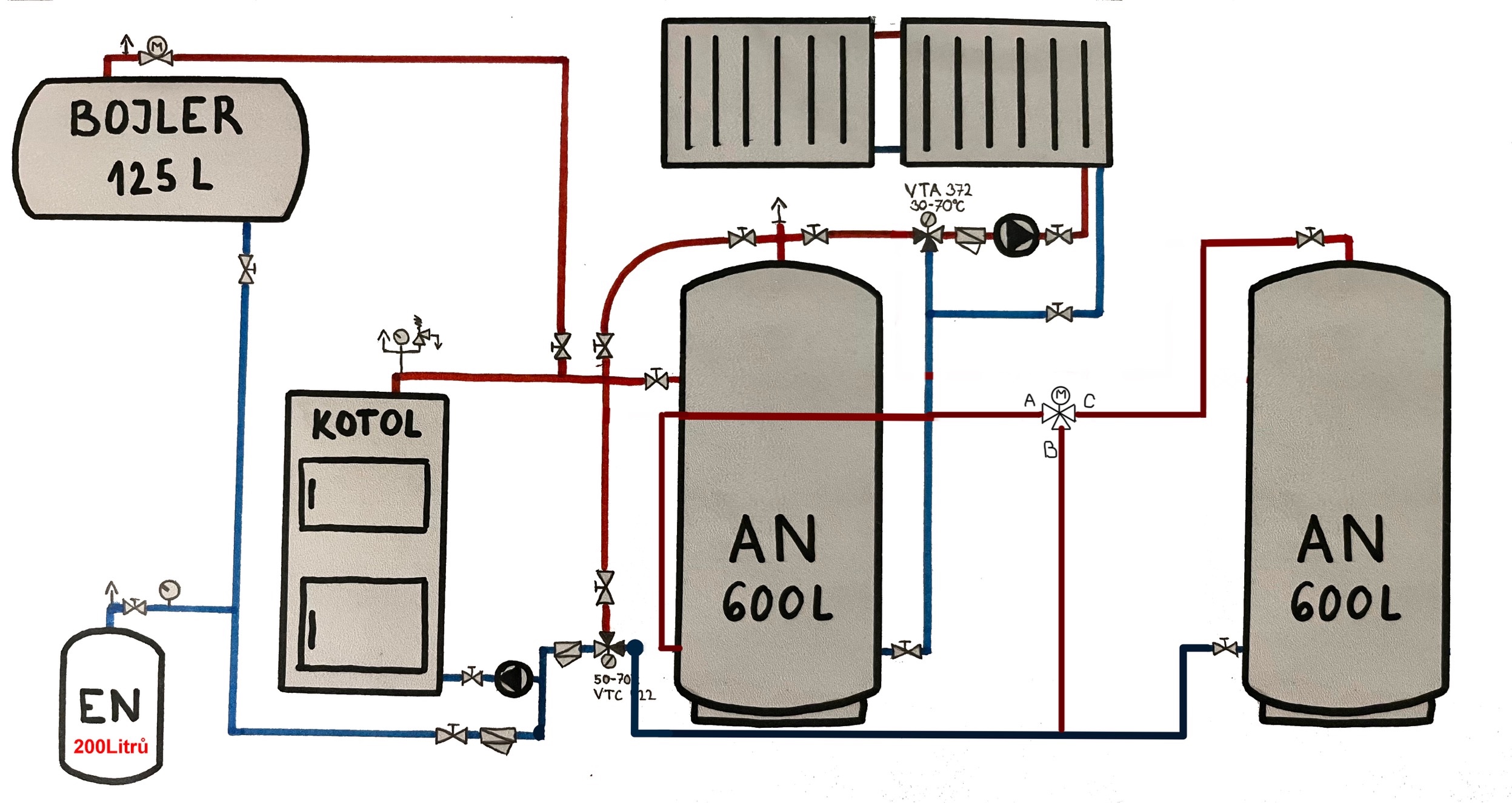 Pawel: ked budu nahriate obe nadrze tak to je vacsinou uz vecer ked sa neprilozi lebo system bude nahriaty a bojler nakureny. Teplo z akumulaciek vydrzi predpokladam do druheho dna az niekde okolo obeda a nez sa zasa zakuri tak ten bojler tolko zase nevychladne aby vnom nic neostalo..teraz nam vydrzy kludne celych 24h tepla voda a to sme styria.v tom taky problem nevidim, preto som ten bojler zapojil aj takto ako to je na scheme lebo mi to tak vyhovuje..Rozumiem ze by bola moznost ho ohriat aj z AN ale ked uz sa kuri tak ten bojler zohreje kotol zachvilku a priorita je teda teplo do radiatorov.