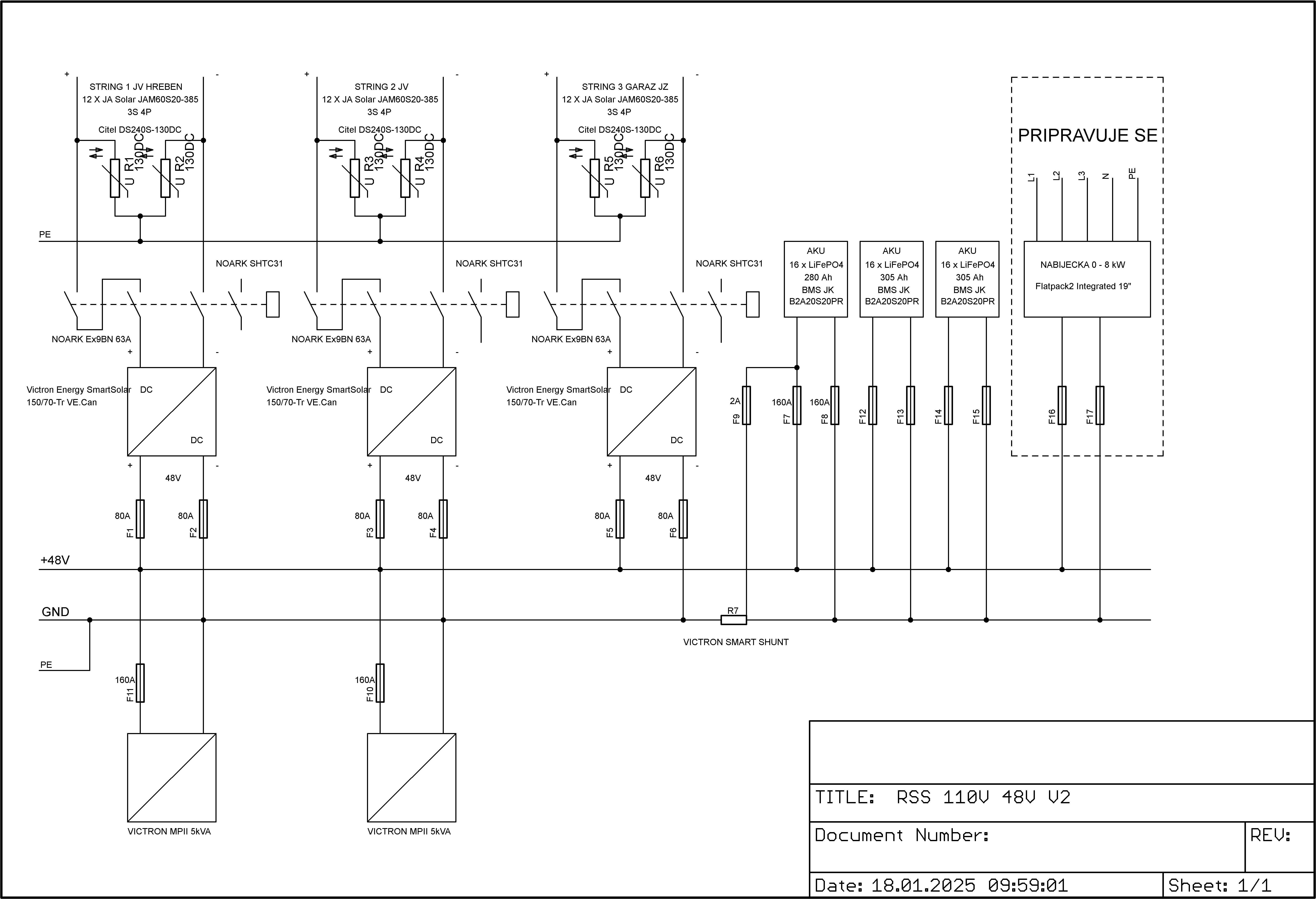 Jak je řešený běžné pospojování rámů u FVE? Panely vidím bez uzemnění, naopak minus je uzemněn u Victron regulátoru což mi něco říká, že to Victron vyloženě nedoporučuje nebo zakazuje. Lze to nějak obecně rozvést, jestli to je pracovní verze nebo ne finální a tudíž ve skutečnosti to bude jinak. ??