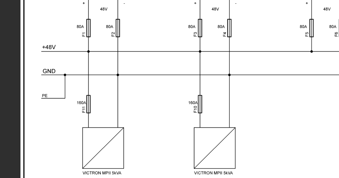Minus je uzeměn za regulátory (48VDC), Victron naopak nařizuje uzemění jednoho pólu.