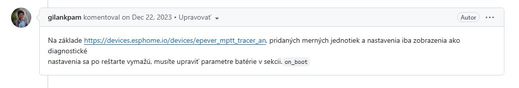 Já normálně z NR parametry do Epever XTRA zapisuju (modbus RS485), tak to přece musí jít i přes EspHome ...zaroven stale hladam návod na plne ovladanie epeveru cez esphome (tak ako to dokaze mt50), konkretne na zapis parametrov, kedze ziadny návod na nete nefunguje. zacinam mat obavu, ze esphome nepodporuje zapisovanie udajov.