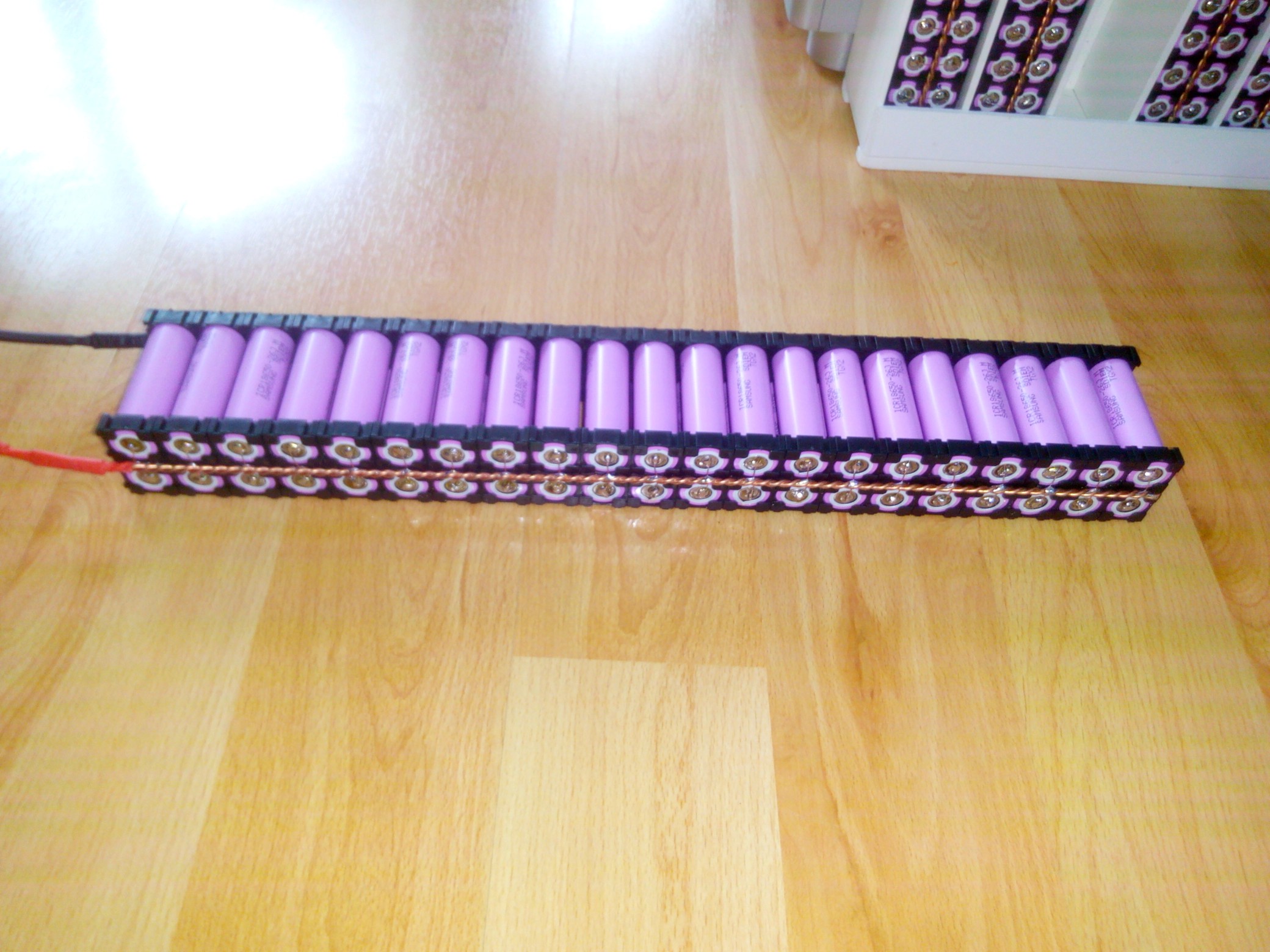 Jako sběrnici jsem použil tvrdý drát 6mm2 a pro připojení na jednotlivé články pocínovaný vodič 0,6mm průměr s GME, čili asi 0,35mm2. 96P 18650, pokud se jeden ze starších článků zkratuje zkratový proud ostatních ho odpojí během milisekund. Jen to prskne (nechtíc vyzkoušeno při montáži). U placek je to jedno, tam se upálí ten páskový vývod.