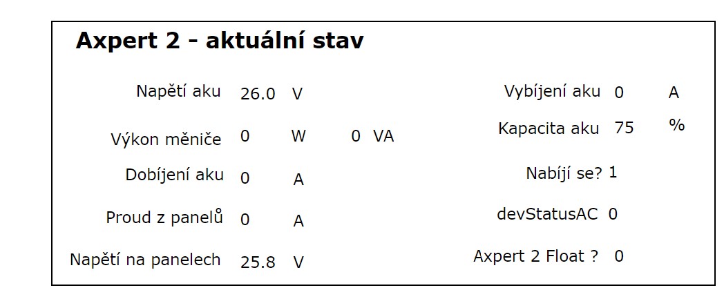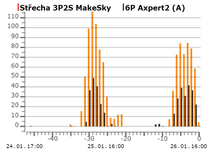 - v hraničních mizerijních podmínkách, jako jsou dneska, je MPPT (Stř.Z) prostě lepší než PWM (Stř.V). A takhle vypadá vývoj od idejí do praxe: mám dva Axperty, jeden z nich funguje už jen jako MPPT regulátor, uvažuji, že ten druhý (momentálně měnič + PWM) budu používat jen jako měnič a pro podobné situace jako dnes koupím ještě jeden MakeSkyBlue...