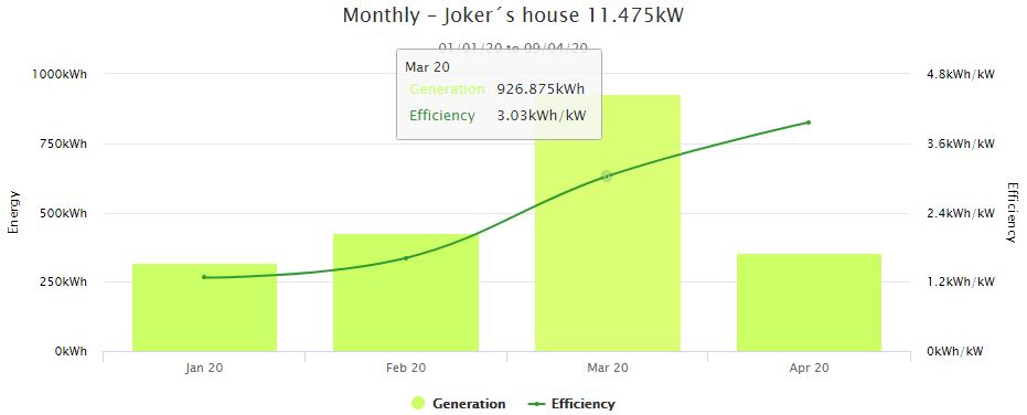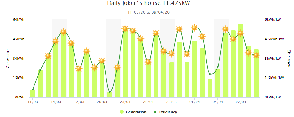 Takot vypadá letošní moje výroba denní, a měsíční 926 kWh za březen. je to fakt super.