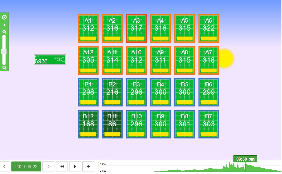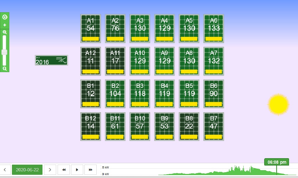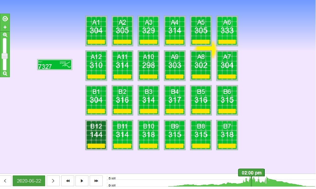 Tady je krásně vidět moment kdy začne padat první stín od sloupu na 12 panel stringu B. obloha bez mráčku.