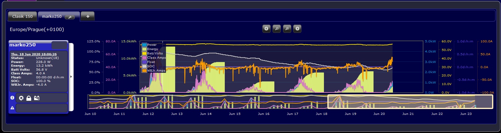 16kWp/JZ-50°/20xChaori 230 ,JV-90°/8xLeapton 650 + <JZ-90° /15xJAsolar / Mono 385, regl Midnite Classic 150<89A> , 1x EASUN <80A> a 1x EASUN <100A>,baterka 17s 54.4VDC LFP4/784Ah<uloží 42kWh>,ŠKATULE 11kW
