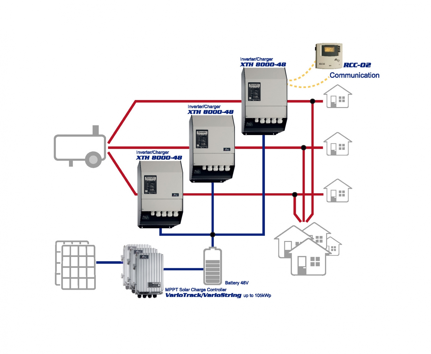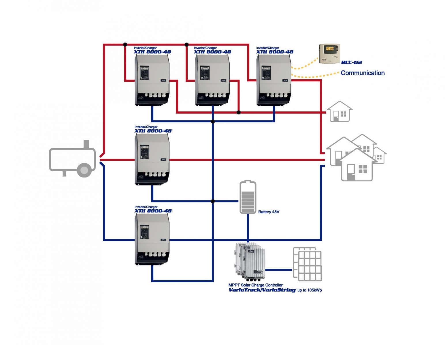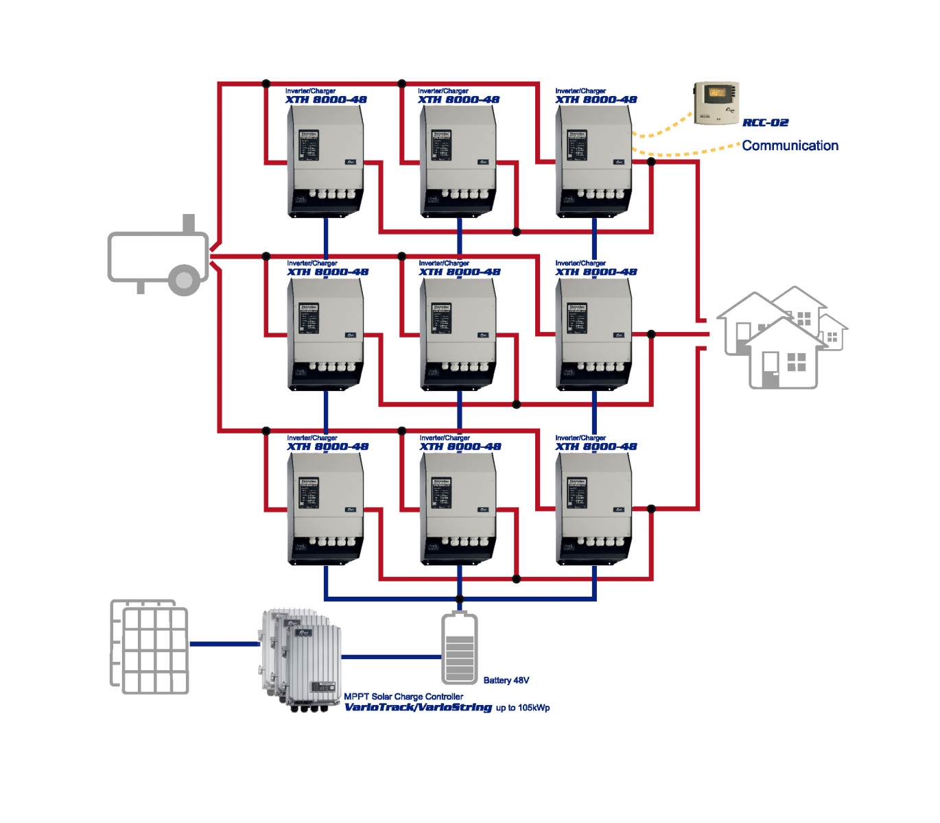 Zapojení stringů má vliv pouze na MPPT, nikoliv na zapojení a počet měničů (Studer XTH).