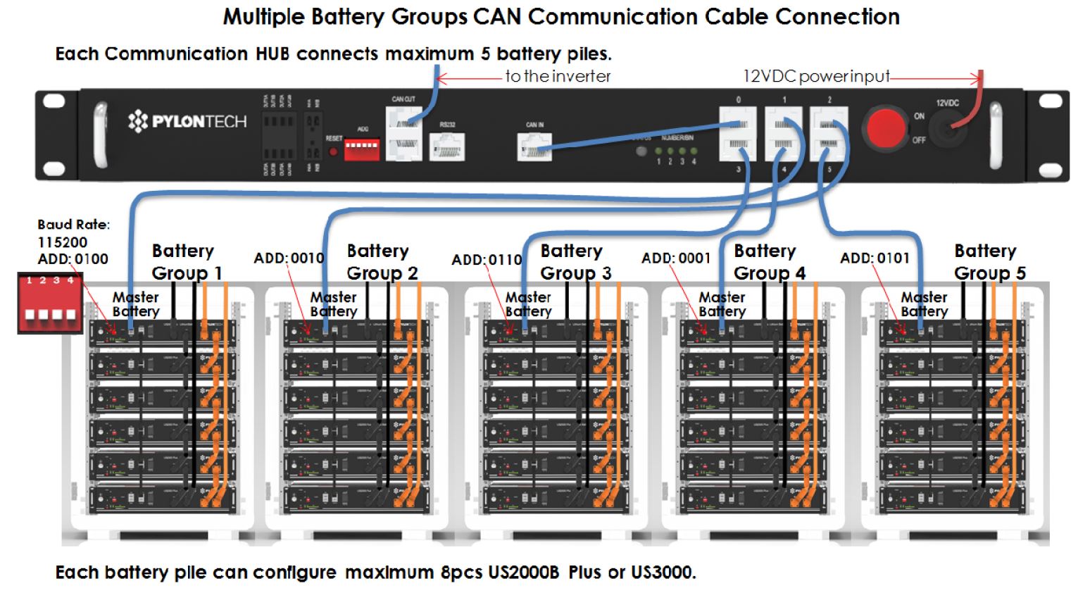 Je-li potřeba připojit více než 8ks, pak se to dělá tak, že silové vedení jde paralelně, zatímco datové kabely se spojí do daisy-chain pro každých 8ks baterek a tyhle osmice se přivedou k centrální jednotce "LV HUB". Škálovat lze tedy do aleluja, viz obr: