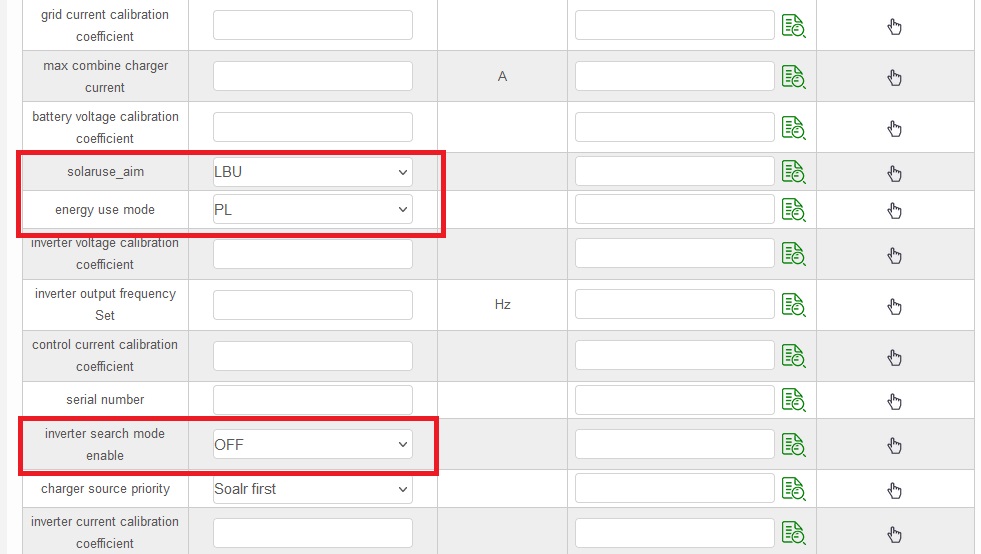 Viz obrázek: Dále solaruse_aim určuje zda má přednost baterka či spotřeba - tady jsem to moc nepochopil u 48V verze je to líp popsané a chová se to jinak jak u mé 24V, ale v zásadě při LBU se dřív přepne z bypassu na soláry, při BLU později při stejném nastavení.