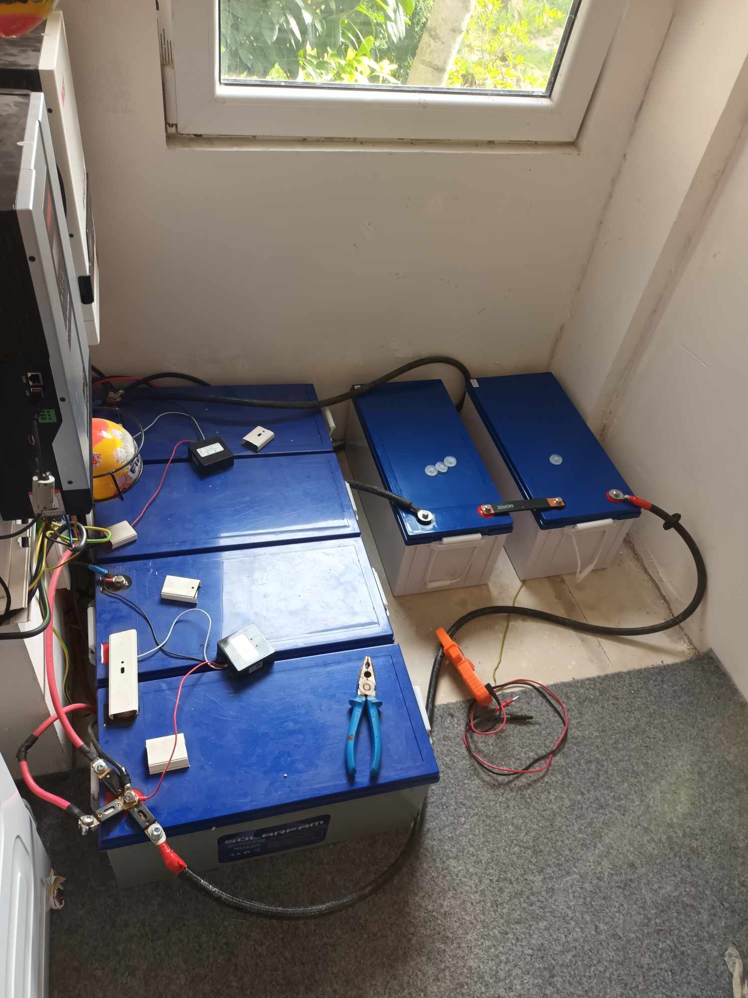 Nedělal jsem žádnou přípravu, baterky stávající ve FVE měli napětí 12,67V a nové z hadexu měli 12,82V, tak jsem je spojil dohromady přes 200A pojistku ale než jsem to natvrdo propojil, tak jsem jen přiložil a změřil klestakem vyrovnávací proud, který byl do 4A a postupně klesal. Baterky již jako jeden celek jsou nyní nabité a měniče do nich posílají okolo 4A ve float.
