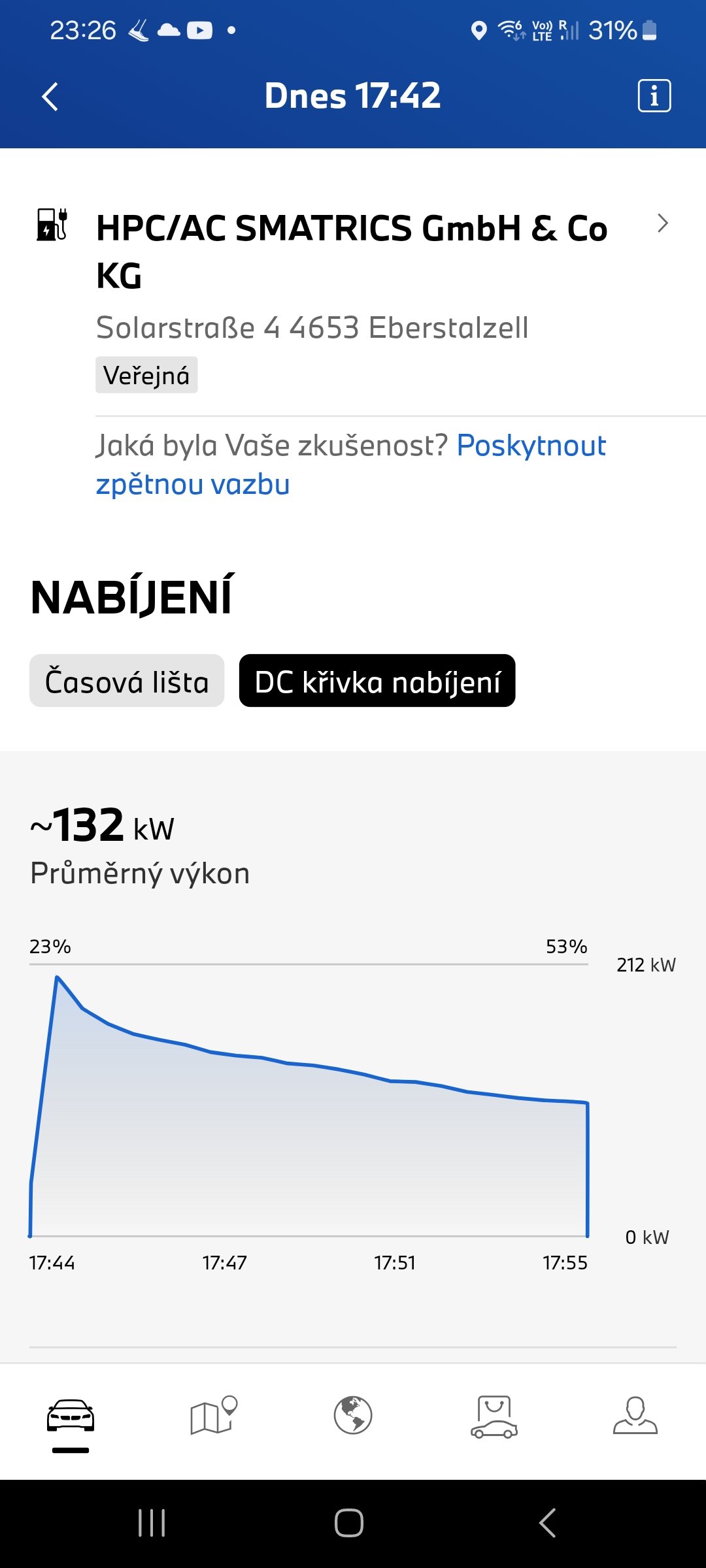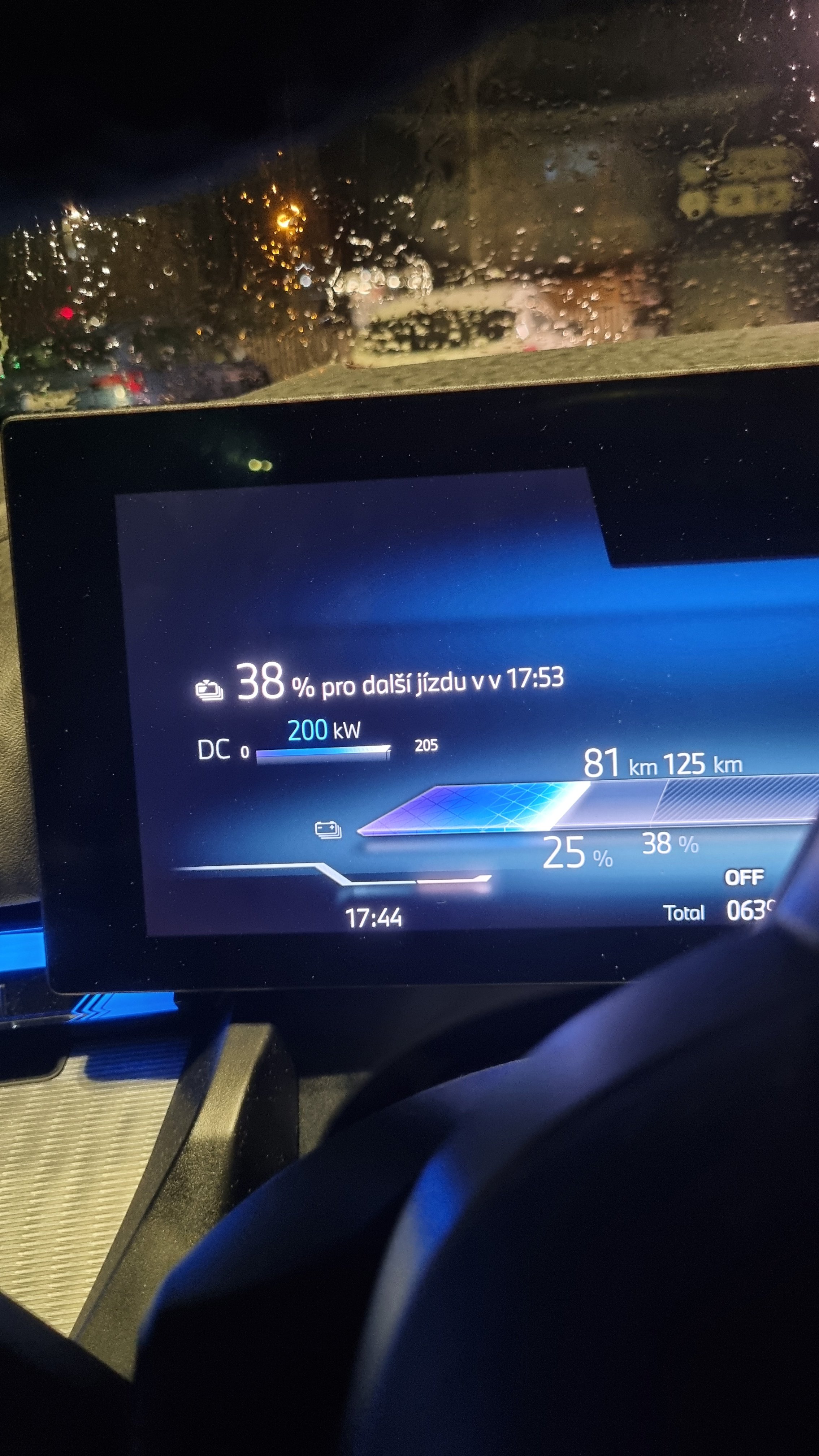 Tak jsem absolvoval cestu 520km v odporném počasí.Auto plnĕ naložené +4 dospělí.Spotřeba cca 24-25kW/100km.Pokud se jede ve velké břečce a proráži se koleje v levém pruhu spotřeba stoupá k 29kWh/100km.Po cca 3 hodinách jsem byl rád, že zastavují na nabíječce.Když jsem viděl,že auto nabíjí i více než 200kW,tak jsem ho odcházel jestli se nekouři a nehřeje nabíjecí pistole a nic.