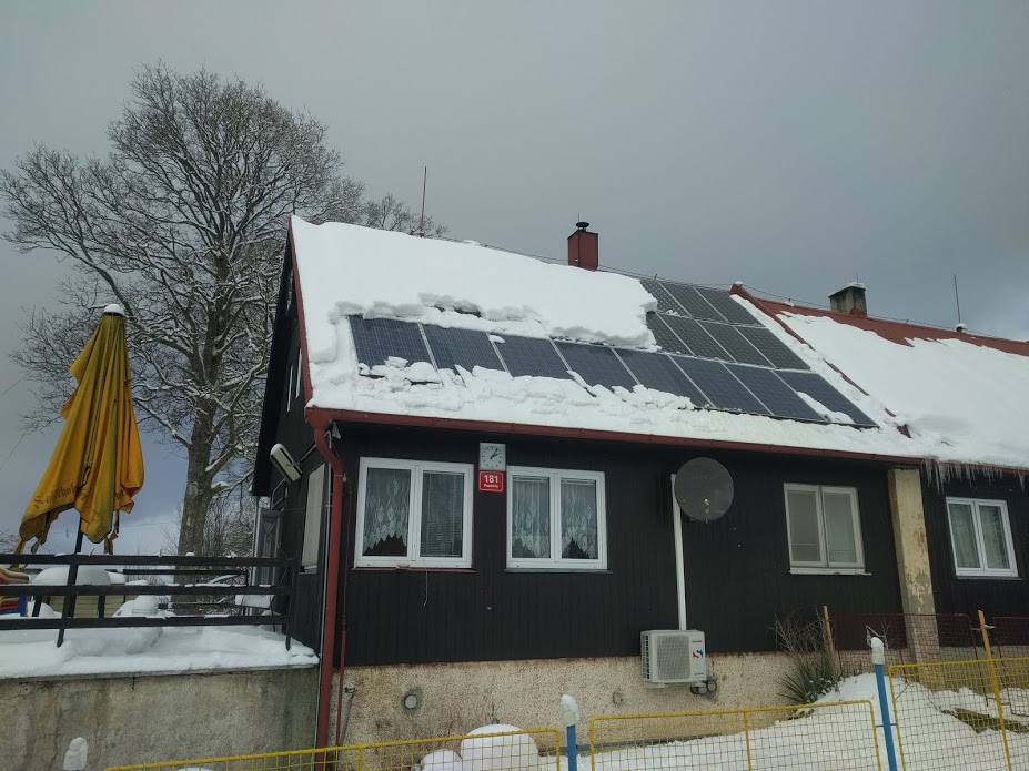 Dnes odpoledne jsem přijel od rodičů. Skoro hodinu jsem ometal panely. Skončil jsem a do hodiny přišla vánice. Po jejím skončení jsem si to cvicne zopakoval znovu. Před chvílí jsem skončil, ometl jsem i západ do parku. Jediná sekce se samočistícím účinkem je jih ve štítu, kde je sklon panelů cca 60 stupňů. Venku je u nás cca-10°C, ještě to půjde dolů.