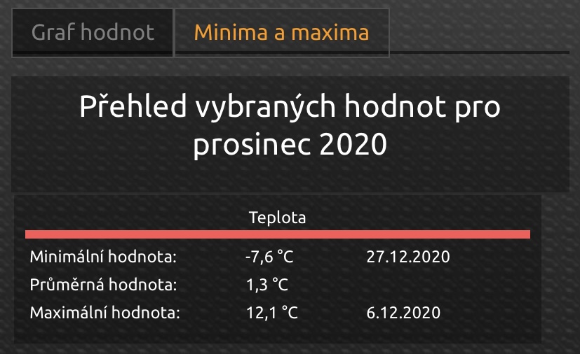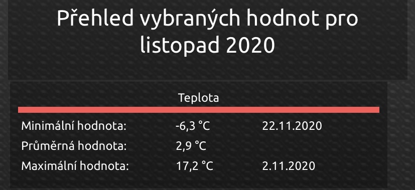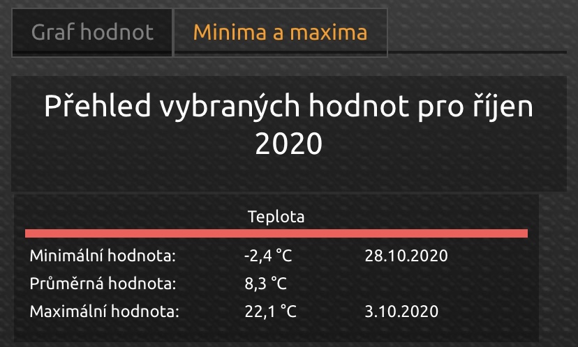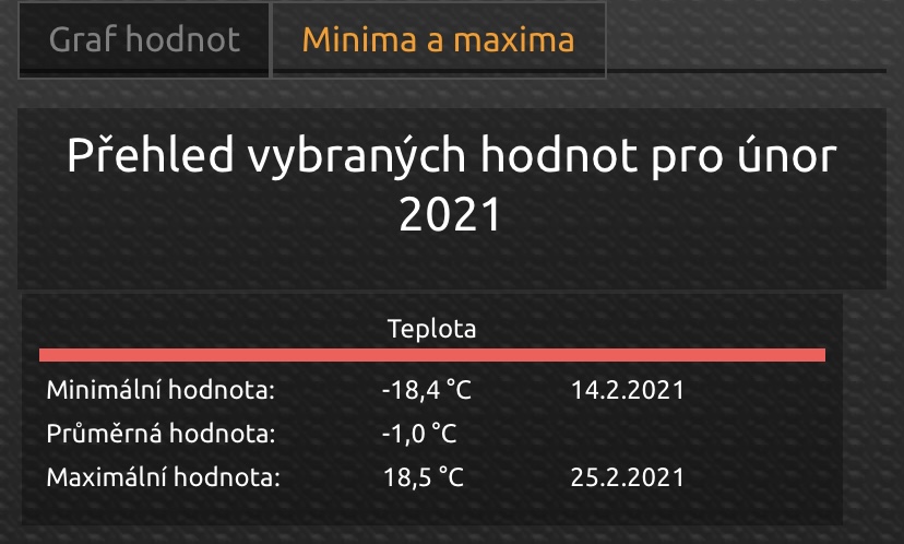 Divam se na to tady: https://www.in-pocasi.cz/archiv/marko250 píše:Má tady někdo meteostanici doma a ukládá teploty za topnou sezónu? Zajímají mě noční minima říjen(10) až březen(3) a denní by mohla taky být.Oblast kolem 200-300m/nm.