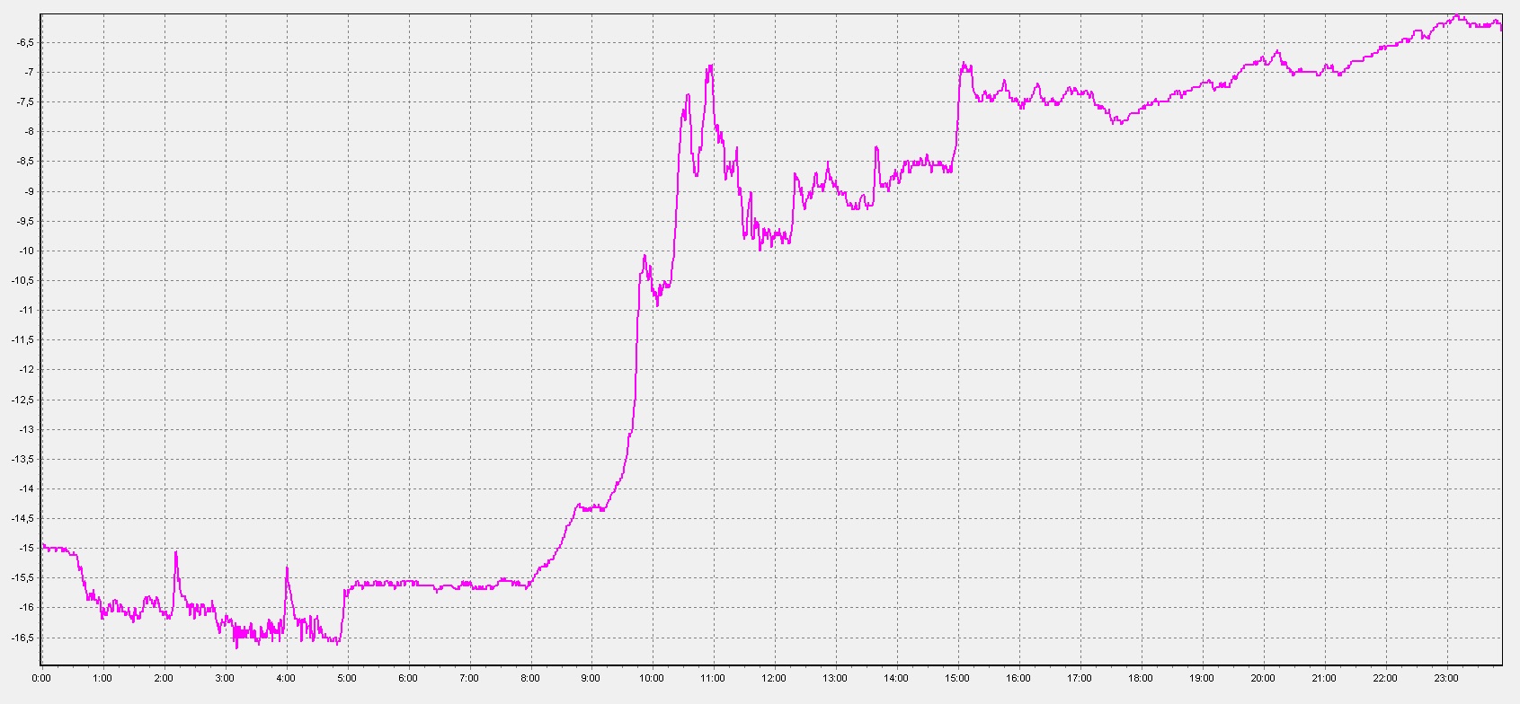 Data jsou z logu TČ uložená po dnech do samostatných souborů na interní flash paměti v proprietálním datovém formátu. Získal jsem k tomu SW, který umí zobrazit jeden den z jednoho předem zvoleného souboru do grafu, který lze následně zoomovat. Nejchladnější den aktuálního topného období u nás vypadá takto: