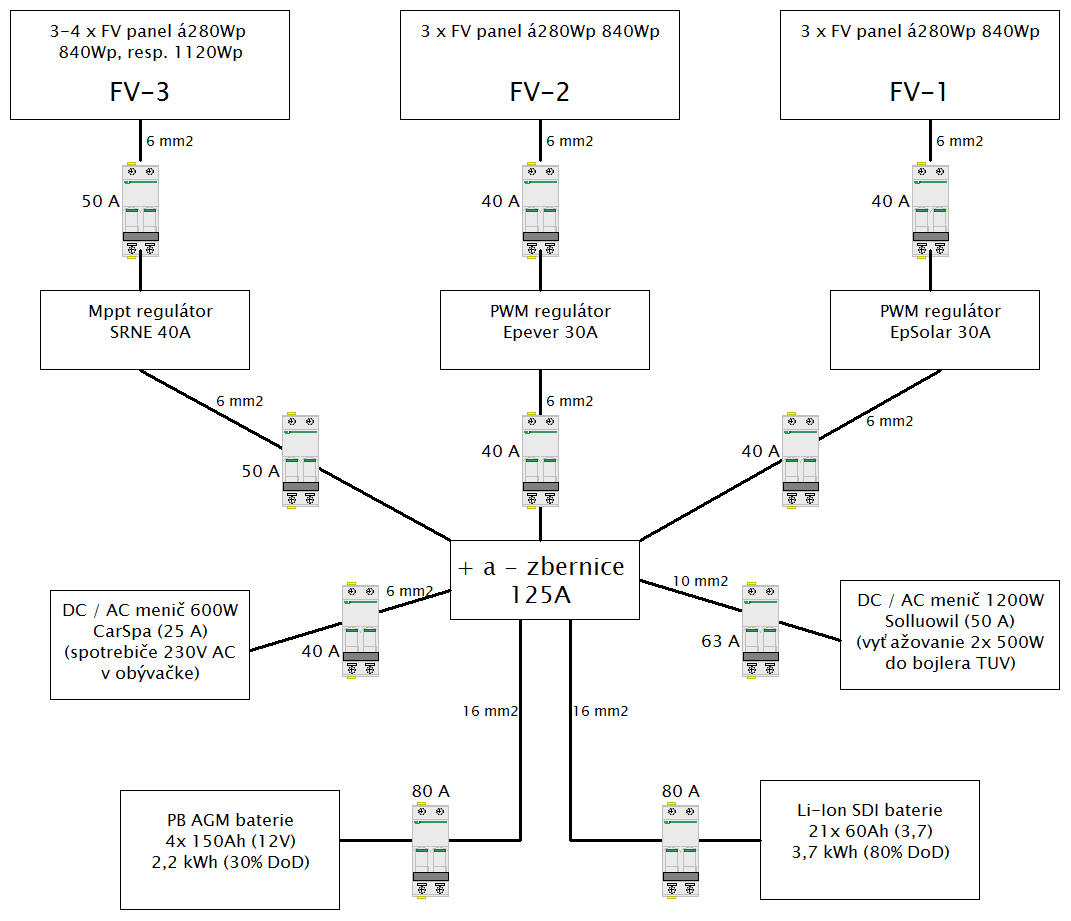 Tenký dráty k baterkám a nedostatečný jištění u baterek. Předpokládám, že je to 24V systém, a 180Ah li-ion dá bez problému 200A, tak proč to hned kazit na začátku, pak si koupíš silnější měnič, a bude problém. Na 200A už jsou jenom nožový pojistky PN1, navíc jistič je na tomto místě skoro až nebezpečnej (odpojení mppt regulátoru v plným kalupu dost často způsobí jeho destrukci). Jak bude napěťově vycházet li-ion proti olovu netuším, možná je to spíš na dva samostatný systémy... Ostatně ty přívody k olovu jsou taky poddimenzovaný. Nejde jenom o to, že se drát neroztaví, ale taky o úbytky napětí.