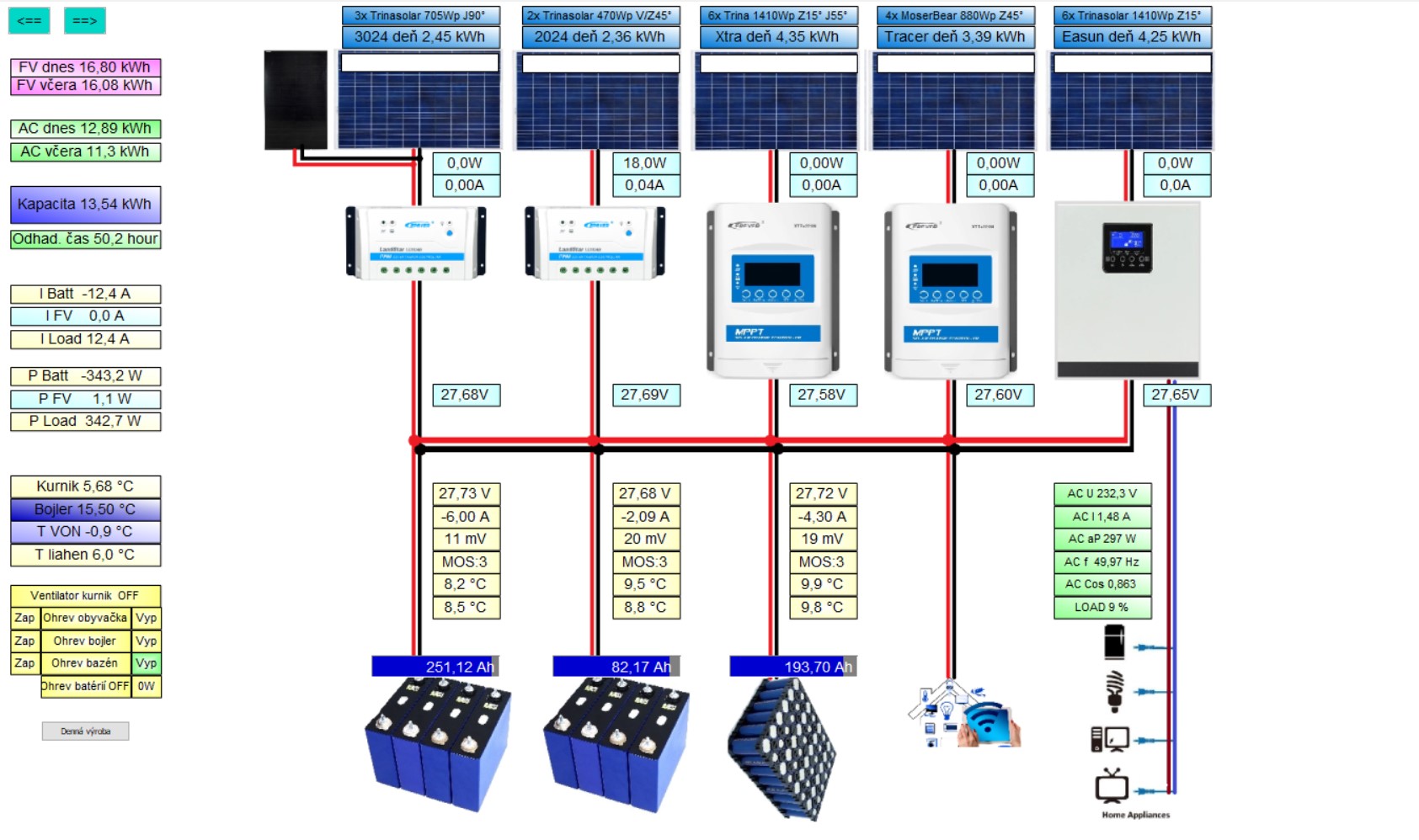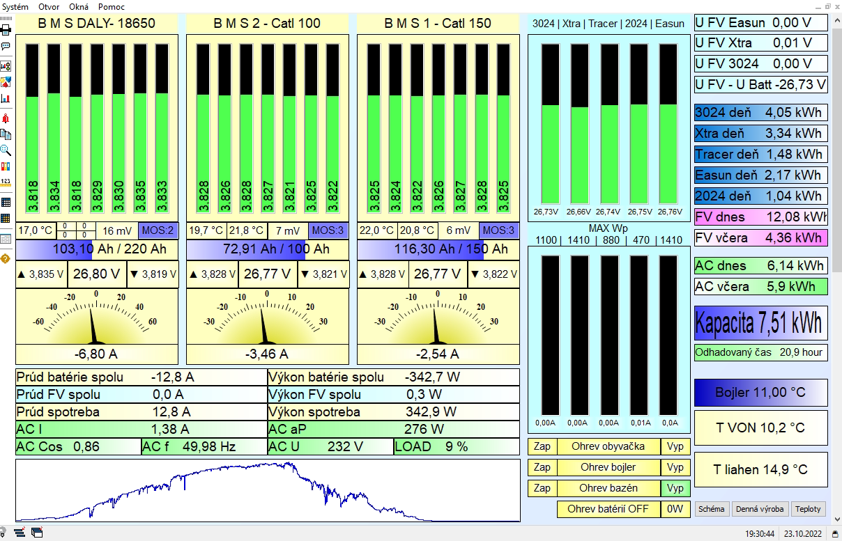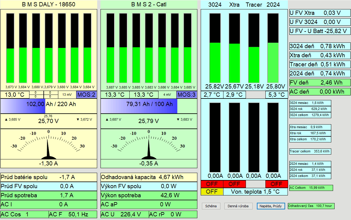 5,4 kWp JJZ 4deg,1,8kWp JV 24deg, do 13.8.2022 bylo 3,6 kWp, MPII 5k, Victron MPPT 250/85-TR, aku 9,45 kWh Lion 15S, BMS 200A, Smart Shunt 500A.