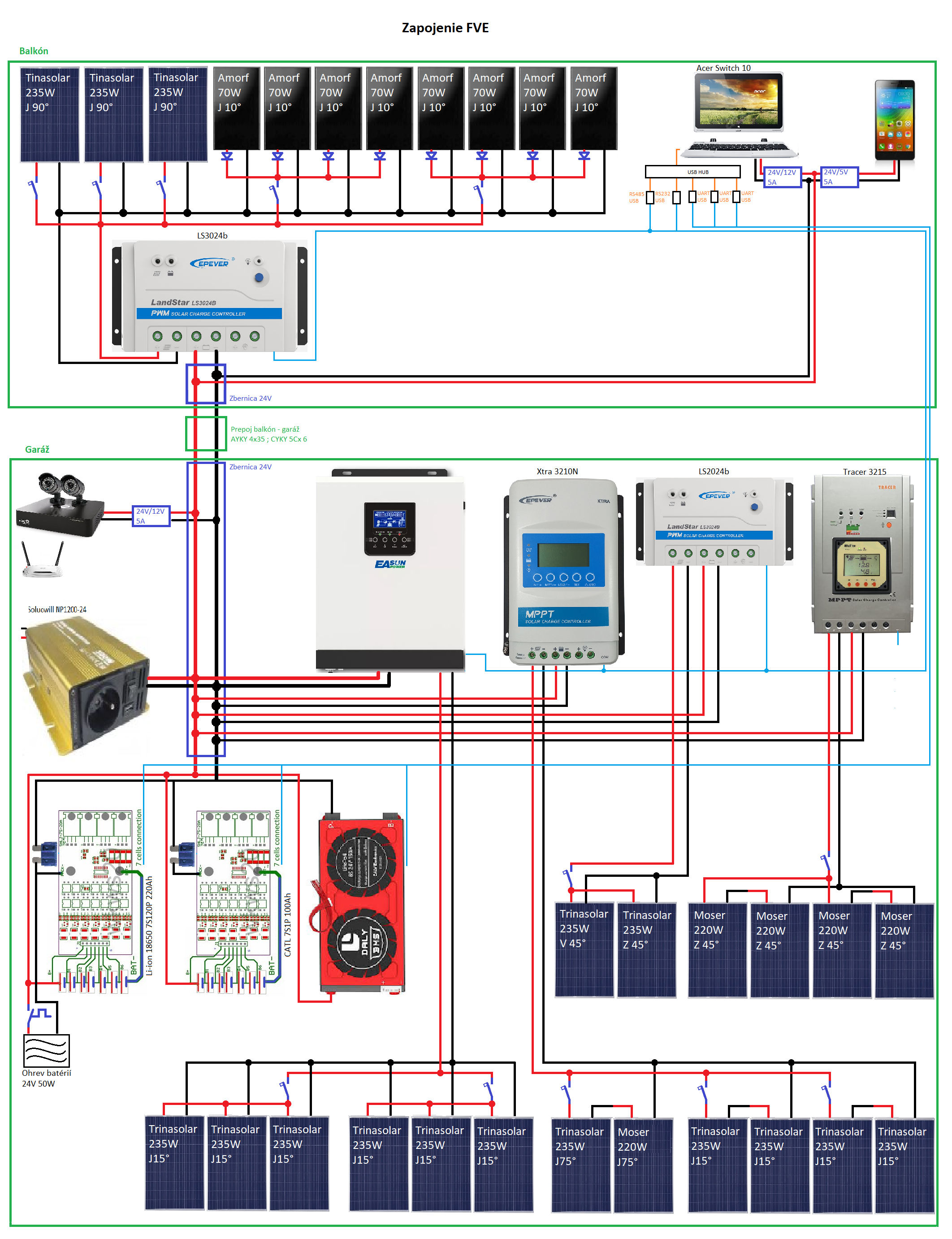 Pribudol menič s regulátorom Easun PWM 3KW 24/230 sinus ,umiestnený v garáži, ktorý napája vybrané okruhy v dome a bojler . Pôvodný Soluowill ostal pre ohrev bazénu , čerpadlo na polievanie záhrady a náradie v garáži.