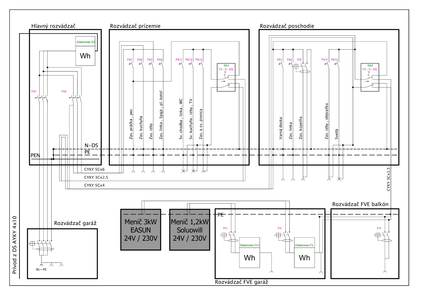 Upravil som rozvádzače ,rozdelil okruhy pre DS a FVE. Pepínanie sieti ostalo manuálne prepínačom, na tých pár prepnutí nemá zatiaľ zmysel to meniť.