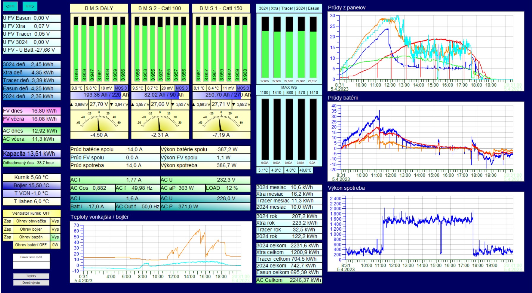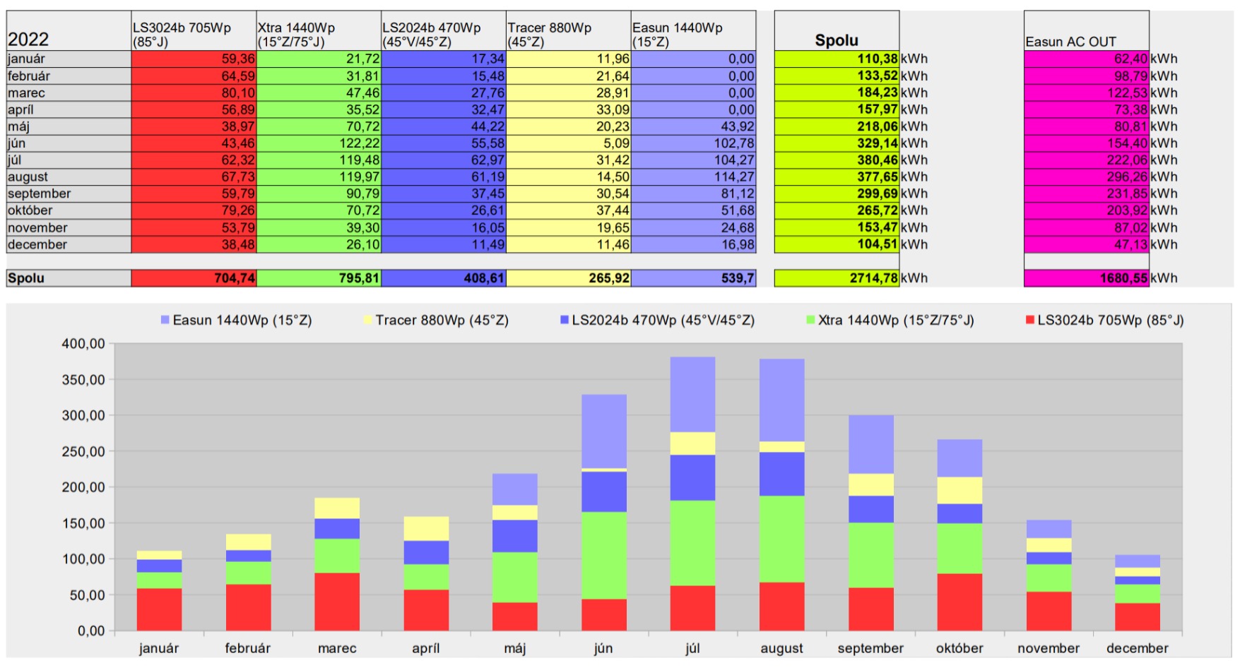 Z panelov bolo vyrobené cez 2,5 MWh , AC za meničom 1,5MWh (liahne , ohrev bazeniku a záhradné čerpadlo cez leto a spotrebiče na 24V sú bez merania , preto ten rozdiel )