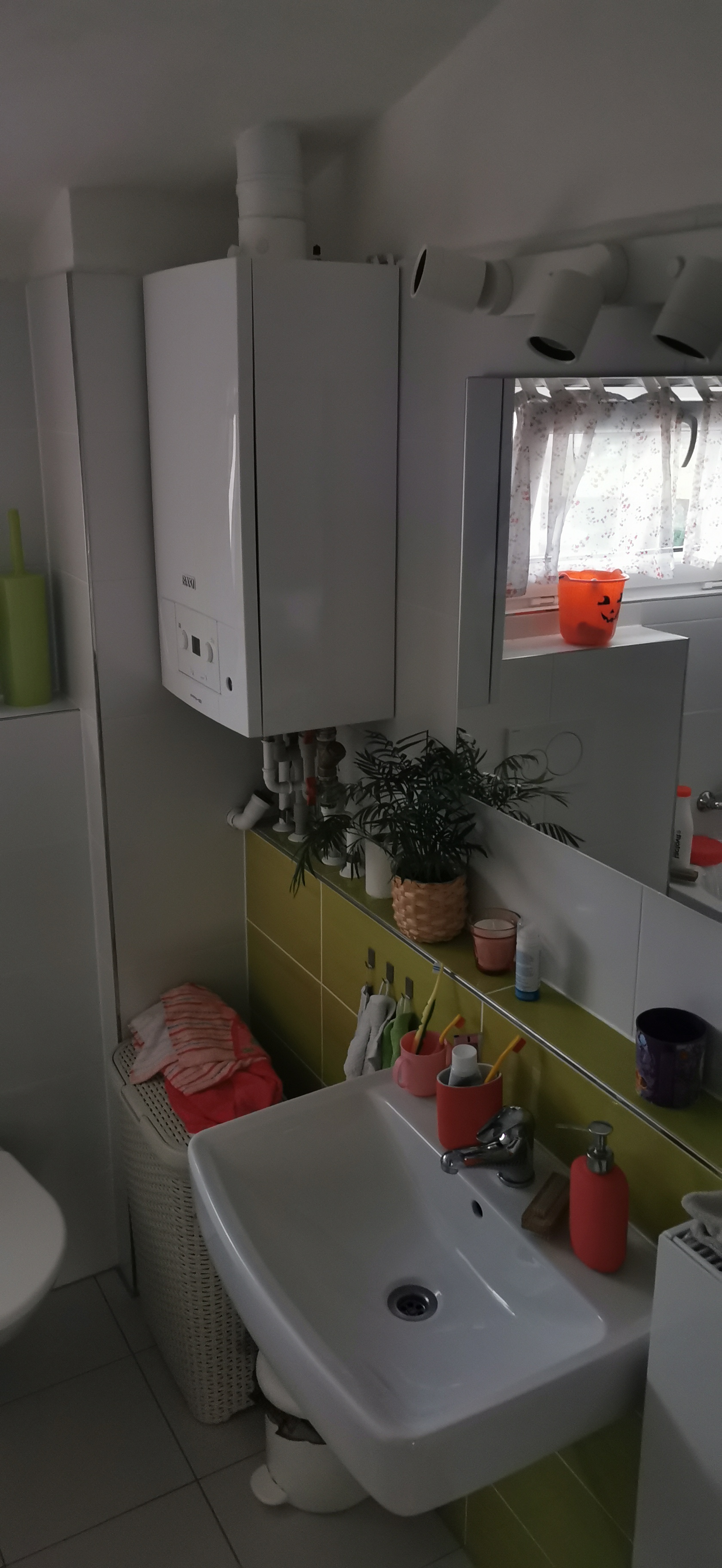 Kondenzační kotel bez akumulace. Co dodat prostě 80m2 na rozloze 6x7m a bez tech mistnosti. Vrchol je klima.