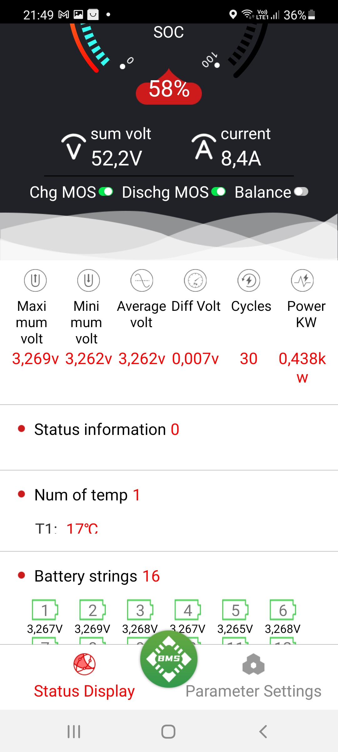 Tak čištění kontaktů a moment mám. Koupil jsem si kvůli tomu momenťák. Ladím to samozřejmě na co nejmíň. 20-80% mají dif 0.002V, ale když jdu pod 20, tak mi jeden článek drží napětí výš než ostatní a naopak nahoře zasse má chuť jít nahoru a ostatní ne. Do 90% je to dif 0.01V ale pak má chuť ujet hodně. Ale asi hold bez komunikace dvcc to nepůjde, takže budu muset rozdělat BMS a vytáhnout ten uart ven a připojit do Victronu. Protože třeba v létě mám plné aku ve 12, ale ne aby se nerozjížděly, tak končím na 100Ah.