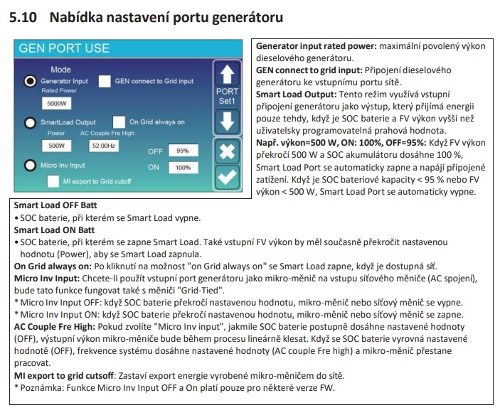 1) pokud je port GENERATOR nastaven do funkce SMART LOAD, pak je ze vstupu "smart" VÝSTUP, který posílá AC v logice a max. výkonu do zátěže, jak si v MENU nastavím ...